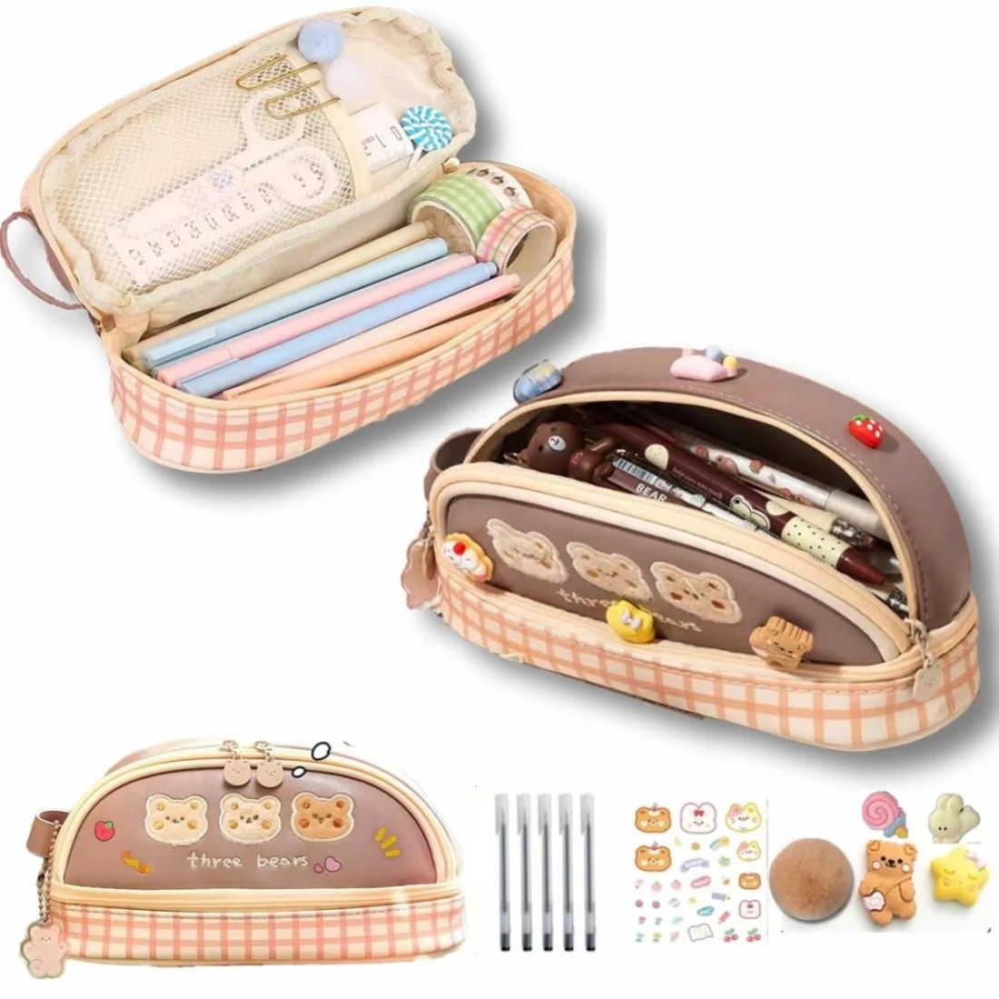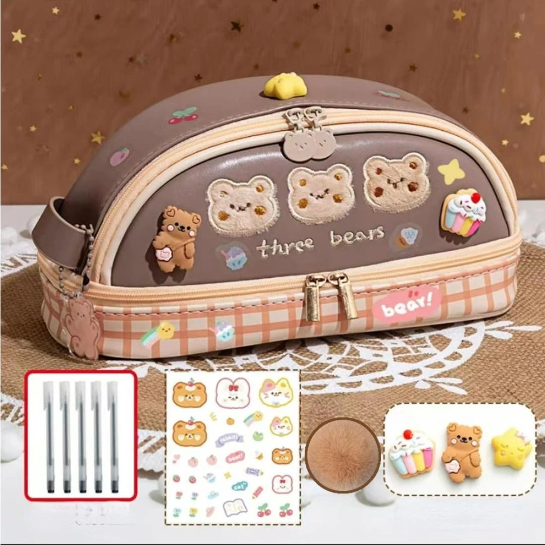 ORTROLA Double Layer Stationery Organizer Box Cute Bear Big Size Pencil Case with Compartment Office Supply Organizer Stationery Box Best Birthday Present Brown Bear