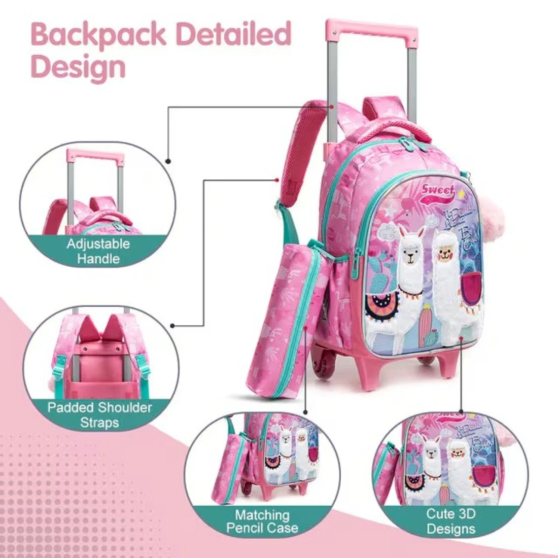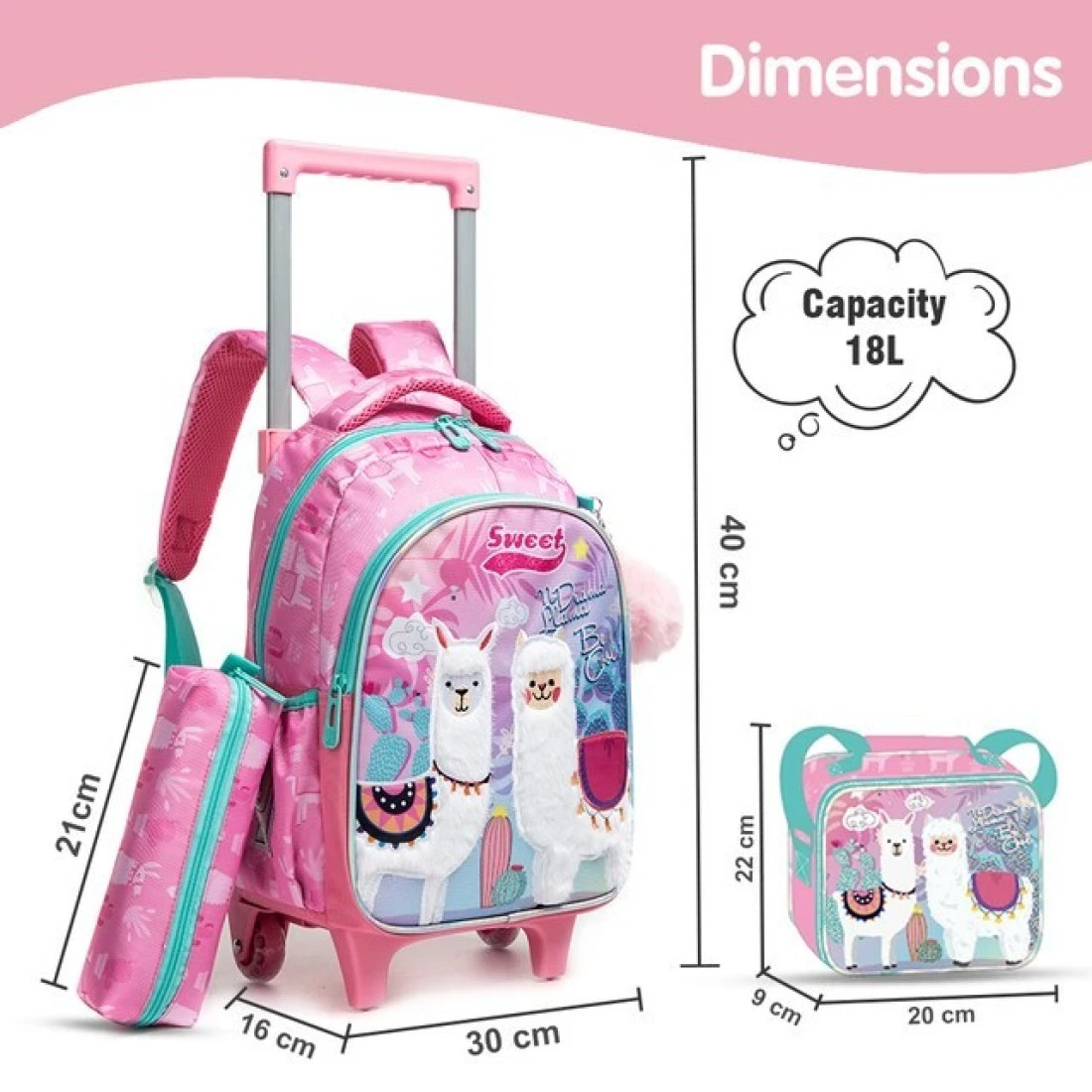 Eazy Kids 16" Set of 3 Trolley School Bag with Lunch Bag and Pencil Case Lama - Pink