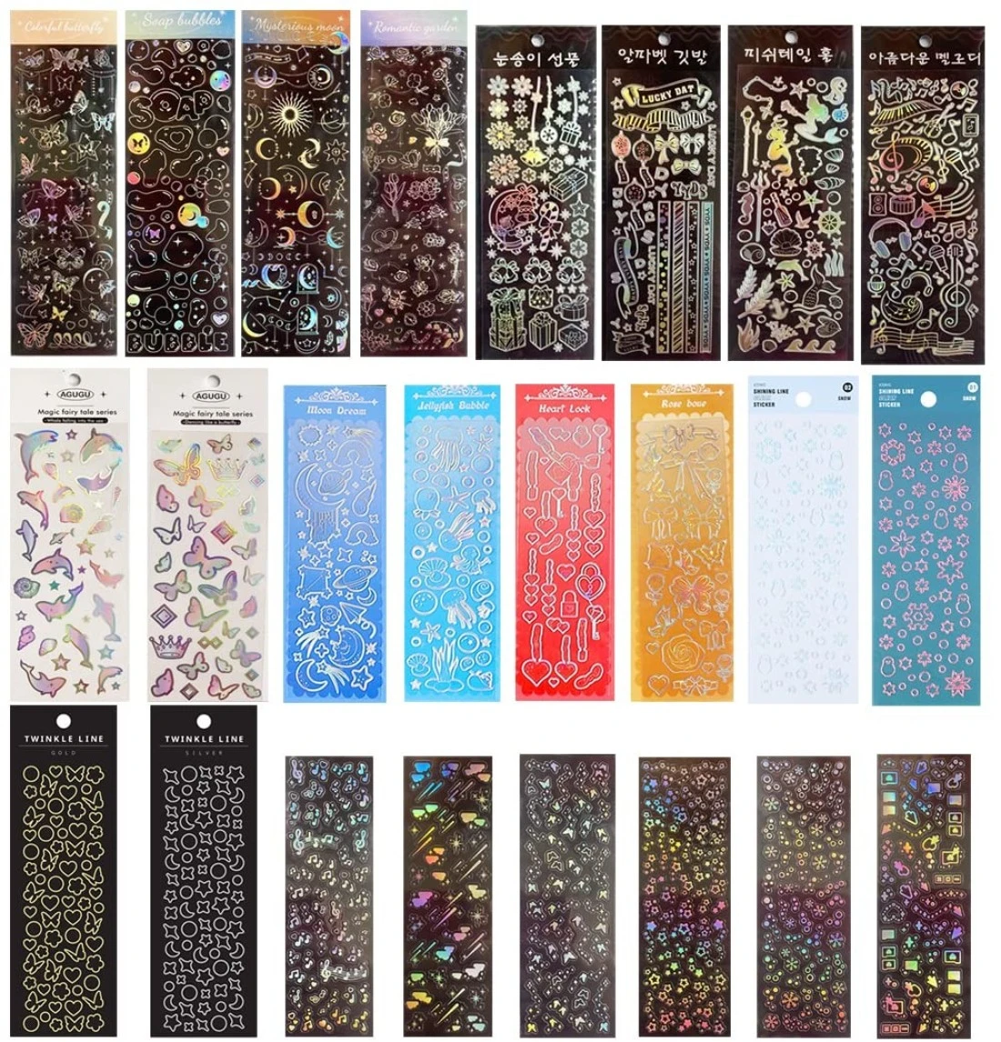 24 Sheets Cute Korean Stickers, Colorful Kpop Stickers for Photocards Ribbon Butterfly Heart Rose Bubble Alphabet Kpop Photocard Deco Stickers for Photocard Binder Album (Gold)