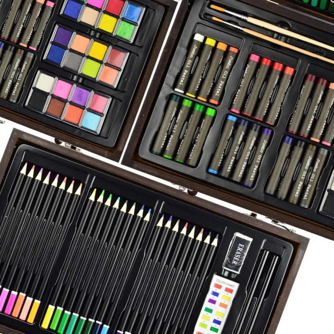 Sunnyglade 145 Piece Deluxe Art Set Wooden Box Drawing Kit with Crayons Oil Pastels Colored Pencils Watercolor Cakes Sketch Pencils Paint Brush Sharpener Eraser Color Chart Cherry