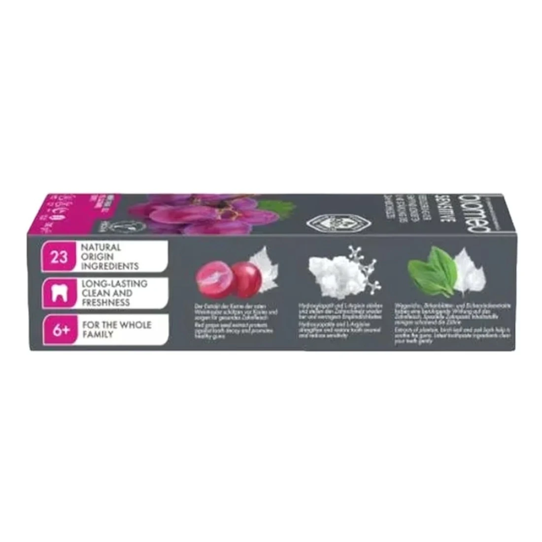 ingredients : ماء، هيدروليزات النشا المهدرجة، ثنائي هيدرات فوسفات ثنائي الكالسيوم، سيليكا رطبة، جليسرين، صمغ السليلوز، كبريتات كوكو الصوديوم، رائحة، كحول البنزيل، ثنائي أسيتات غلوتامات رباعي الصوديوم، بيكربونات الصوديوم، هيدروكسيباتيت، صمغ الزانثان، المنثول، مينثيل لاكتات، أرجينين، ثاني أكسيد التيتانيوم، مستخلص بذور Vitis Vinifera، بابين، ديسيل غلوكوزيد، زيت بذور ميليا أزاديراختا، مالتوديكسترين، مستخلص فاكهة أناناس ساتيفوس، مستخلص أوراق ستيفيا ريبوديانا، زيت الغدة الصعترية، مستخلص أوراق بيتولا ألبا، مستخلص أوراق لسان الحمل الرئيسي، زيت البوسويليا سيراتا، زيت قشر الليمون الحمضي، كابسانثين/كابسوروبين، CI 75470، زيت بذور دوار الشمس، مستخلص لحاء كيركوس ألبا، هيدروكسيد الصوديوم، بنزوات الصوديوم، سوربات البوتاسيوم، الليمونين.