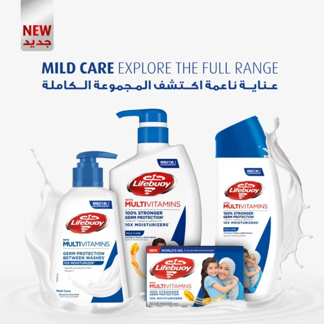 جرب التركيبة الجديدة متعددة الفيتامينات من غسول الجسم لايفبوي المضاد للبكتيريا، والتي تمنحك ولعائلتك حماية أقوى من الجراثيم بنسبة 100%.* مناسب لجميع أنواع البشرة، بما في ذلك البشرة الحساسة، هذا الغسول القوي المضاد للبكتيريا والمنظف للبشرة يحسن النظافة اليومية مع كل استخدام. يصل مزيج التخلص من السموم هذا إلى عمق المسام لمعالجة البكتيريا غير المرغوب فيها والمساعدة في منع الرائحة - كل ذلك دون الإخلال بتوازن الرطوبة الطبيعي لديك. لقد تم اختباره من قبل أطباء الجلدية للتأكد من أنه آمن لك ولأحبائك، لذلك حتى الأطفال يمكنهم استخدام غسول الاستحمام اللطيف والفعال للغاية. شاهد غسول الجسم المطهر هذا يتحول إلى رغوة غنية تحت الماء الجاري، مما يجعلك تشعر بالانتعاش والنظافة على الفور. كما أنه غني بمرطبات ×10 التي تغذي أثناء الاستحمام، مما يساعد على دعم حاجز بشرتك ومنع التهيج. ضعي كمية صغيرة من غسول الجسم المنعش المضاد للبكتيريا على قطعة قماش مبللة في الحمام أو الدش واستخدميه بالكامل قبل شطفه جيدًا، وتجفيفه واستخدام بقية نظام العناية بالبشرة للحصول على بشرة محمية وناعمة. لايفبوي هو الصابون رقم 1 في العالم للحماية من الجراثيم، وتثق به العائلات في كل مكان. اكتشف المزيد من منتجات ميلد كير ومجموعات لايف بوي الأخرى التي تحمي الجراثيم الآن. *وفقًا للاختبار المعملي على الكائنات الحية المؤشرة مقارنة بالصابون العادي الذي لا يحتوي على مواد نشطة^ ارجع إلى مستخلص كريمة الحليب مقارنة بالتركيبة السابقة