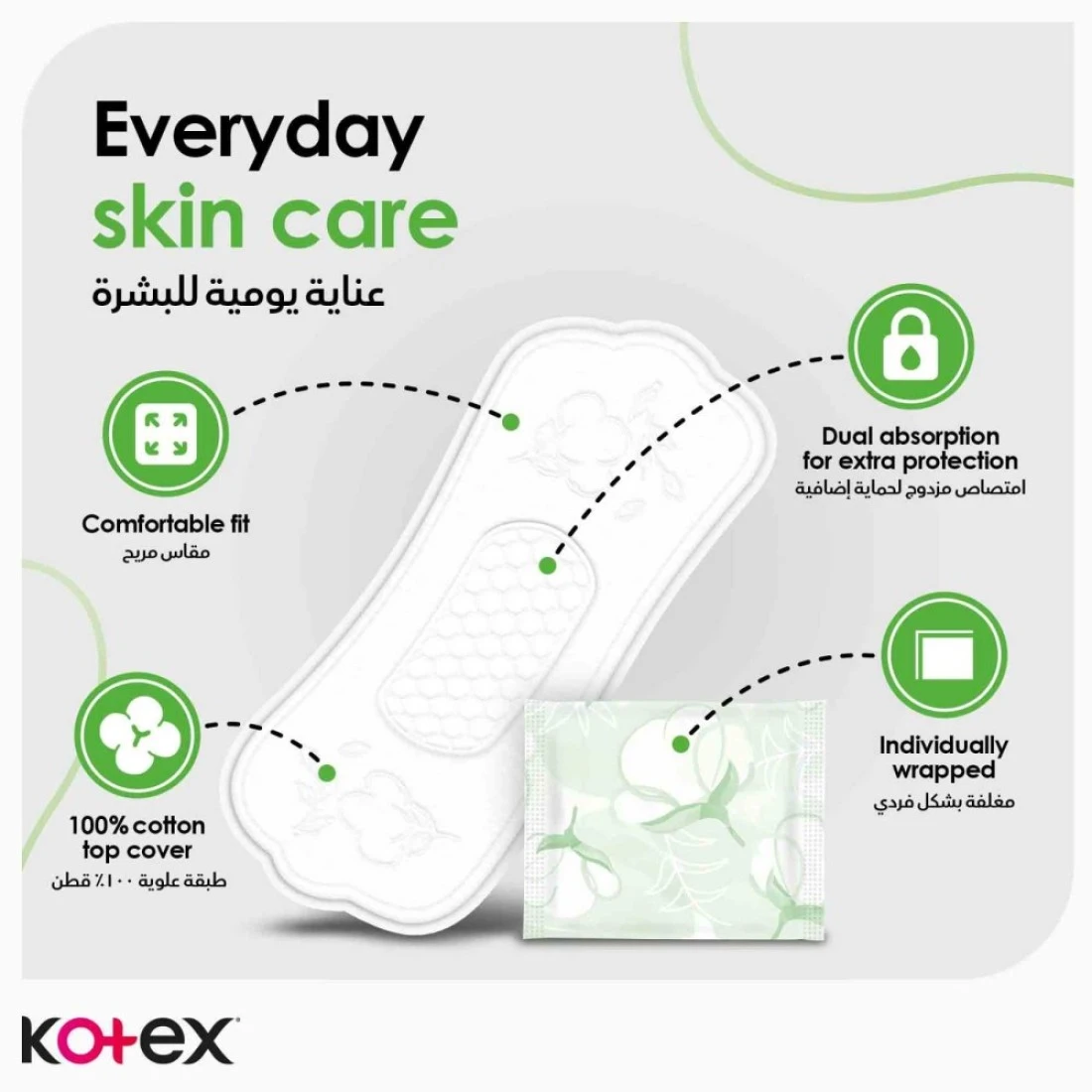 - هذه الفوط اليومية ناعمة وممتصة بشكل طبيعي لتجعلك تشعرين بالانتعاش والحيوية. تنظيف ما يصل إلى 100٪ كل يوم