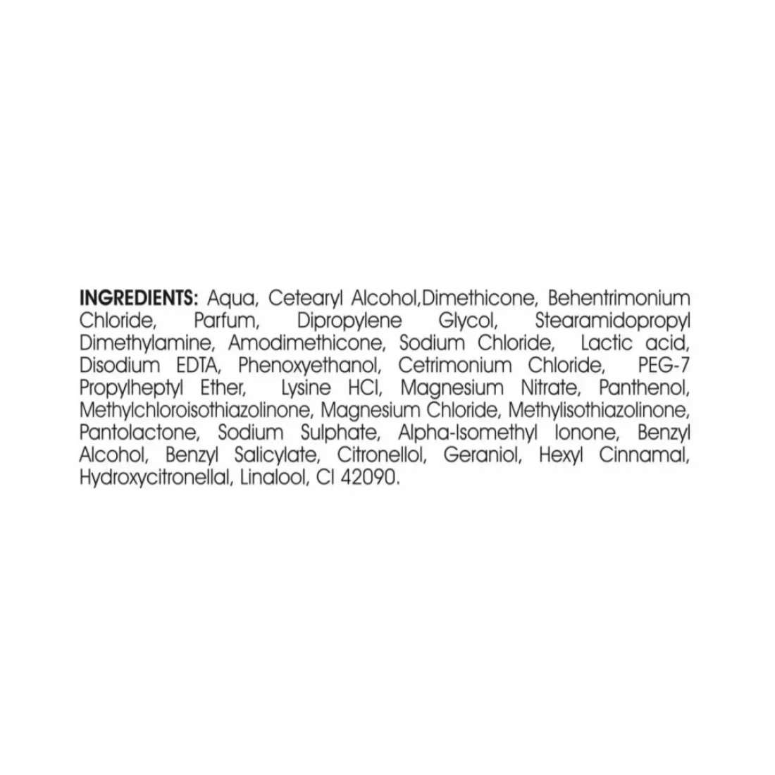 ingredients : أكوا، كحول سيتريل، دايميثيكون، كلوريد البينتريمونيوم، عطر، ديبروبيلين غليكول، ستيراميدوبروبيل ثنائي ميثيل أمين، أموديميثيكون، كلوريد الصوديوم، حمض اللاكتيك، ثنائي الصوديوم EDTA، فينوكسي إيثانول، كلوريد السيتريمونيوم، إيثر بروبيل هيبتيل PEG-7، ليسين Hci، نترات المغنيسيوم، بانثينول، ميثيل كلورو أيزوثيازولينون، كلوريد المغنيسيوم، ميثيل أيزوثيازولينون، بانتولاكتون، كبريتات الصوديوم، ألفا-لسوميثيل لونون، كحول بنزيلي، ساليسيلات البنزيل، سيترونيلول