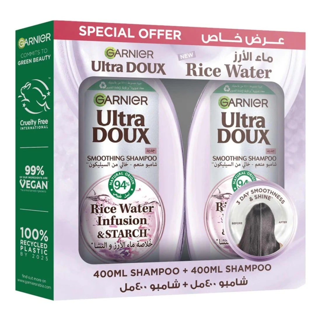 غارنييه أولترا دو شامبو بمستخلص ماء الأرز والنشاء لتنعيم الشعر 400 ملل، حزمة من 2