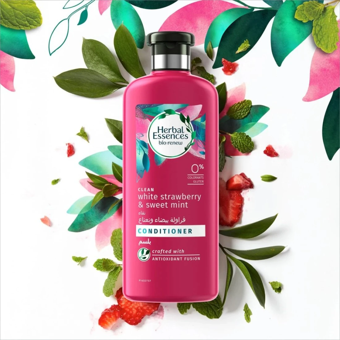 هيربل إسنسز بيو رينيو تنظيف بلسم شعر بالفراولة البيضاء والنعناع الحلو وردي 400 ملل