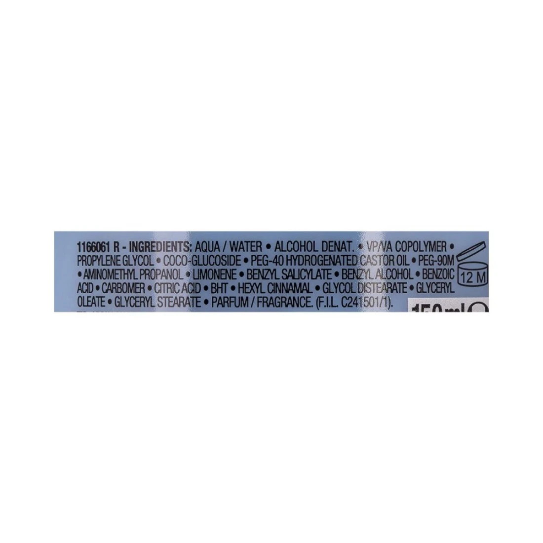ingredients : ماء، كحول الدينات، كوبوليمر في بي/فا، بروبيلين غليكول، هيدروكسي إيزوهيكسيل 3-سيكلوهكسين كاربوكسالدهايد، Peg-40 زيت الخروع المهدرج، Peg-90m، ثلاثي إيثانولامين، ليمونين، بنزوفينون-4، بنزيل ساليسيلات، بنزيل الكحول، كاربومير، بوتيلفينيل ميثيلبروبيونال، هيكسيل سينامال، كوبوليمر ستايرين/أكريلات، وعطر.