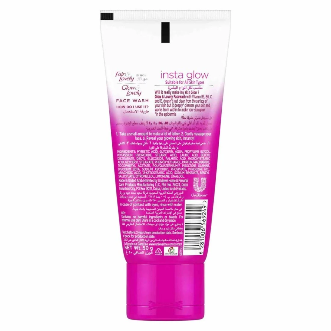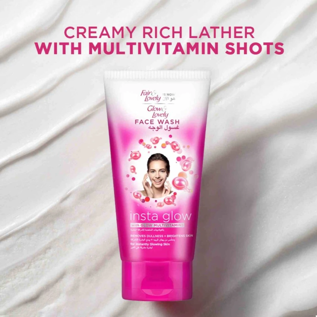 يقدم لك غسول الوجه من جلو آند لوفلي إنستانت جلو (المعروف سابقًا باسم فير آند لوفلي إنستانت جلو) الغني الفيتامينات المتعددة مثل فيتامين B3 و C و E لتغذية وترطيب بشرتك من الداخل لتمنحك إشراقًا. يستبدل البشرة الباهتة ببشرة أكثر إشراقًا! ينظف بعمق لإزالة الأوساخ والتلوثات من داخل بشرتك مع كل استخدام. يقشر لإزالة الخلايا الميتة للجلد ويساعد على إزالة الجراثيم التي تسبب البكتيريا لإزالة الشوائب من المسام مع كل غسلة. يغسل جميع الشوائب الجلدية ويعزز دفاعات البشرة. ينظف غسول الوجه بشرتك بفعالية ليمنحك ترطيبًا فوريًا لبشرتك وبشرة متألقة. يتميز هذا الغسول بتركيبة خاصة بالجلسرين وحمض الأحمر والمحسن بمتعدد الفيتامينات لضمان بشرة متألقة ونظيفة وواضحة. فوائده هي 1. بشرة نظيفة ومشرقة 2. لمعة فورية ونظيفة 3. شعور ناعم وأكثر نضارة لمظهر صحي 4. تعزيز دفاعات البشرة. يتم تصنيعه خصيصًا ليتناسب مع جميع أنواع البشرة. تم تقييم جلو آند لوفلي الجديد في الاختبارات السريرية والاستهلاكية للفوائد المدعوة بنتائج ممتازة تم تصديقها وتأييدها من قبل أطباء الجلد الشهيرين دوليًا وكذلك من قبل المستهلكين أنفسهم. للحصول على أفضل النتائج، استخدميه مرتين يوميًا في الصباح والمساء. لتحقيق روتين العناية بالبشرة الجيد، يوصى بترطيب البشرة باستخدام كريم الوجه جلو آند لوفلي أدفانسد مولتيفيتامينز. إن جلو آند لوفلي هي علامة تجارية رائدة في العناية بالبشرة تخدم ملايين الناس حول العالم عن طريق تقديم منتجات آمنة وفعالة وبأسعار معقولة التي توفر بشرة متألقة وموحدة ومشرقة. جلو آند لوفلي هو أول كريم في العالم يستخدم فيتامين B3 (نياسيناميد) والذي يعرف بتفتيح البشرة وتقليل الالتهابات وزيادة الترطيب وتحسين ملمس البشرة بشكل عام.