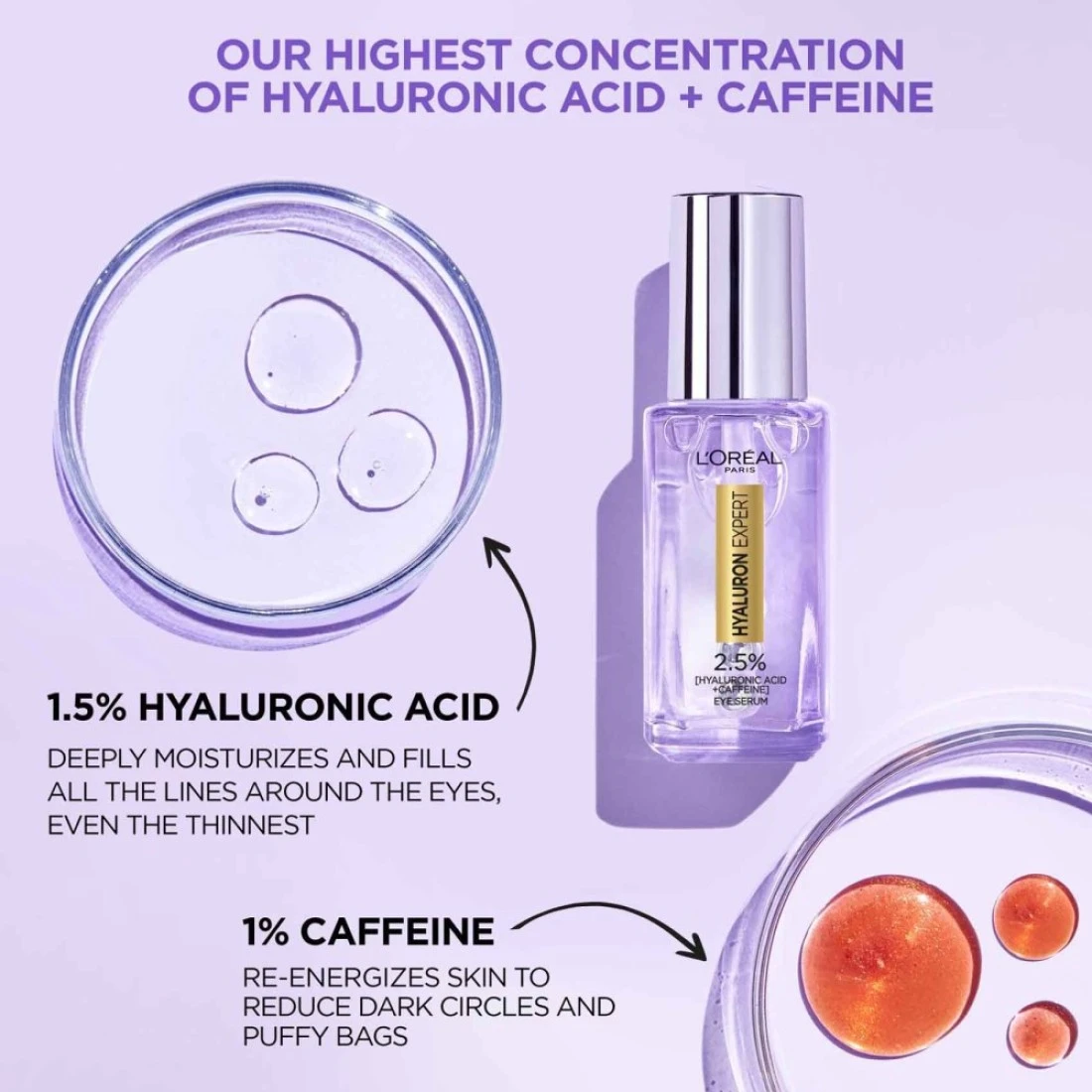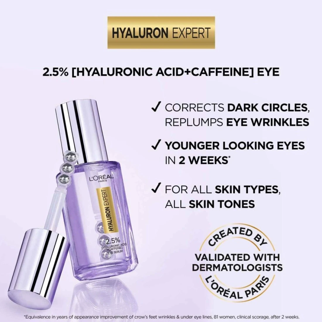 إن سيروم لوريال باريس هيالورون إكسبرت للعين هو مصل قوي وفعال يستهدف البشرة الحساسة حول العينين. يتكون من حمض الهيالورونيك وهو مكون قوي معروف بخصائصه المرطبة لملء البشرة وتنعيمها مما يقلل من ظهور الخطوط الدقيقة والتجاعيد. يساعد هذا المصل أيضًا على تفتيح منطقة تحت العين مما يقلل من الهالات السوداء والانتفاخ للحصول على مظهر أكثر شبابًا وانتعاشًا. بفضل تركيبته خفيفة الوزن وغير دهنية، يتم امتصاص مصل العين هذا بسهولة في البشرة مما يتركها تشعر بالتغذية والنشاط.