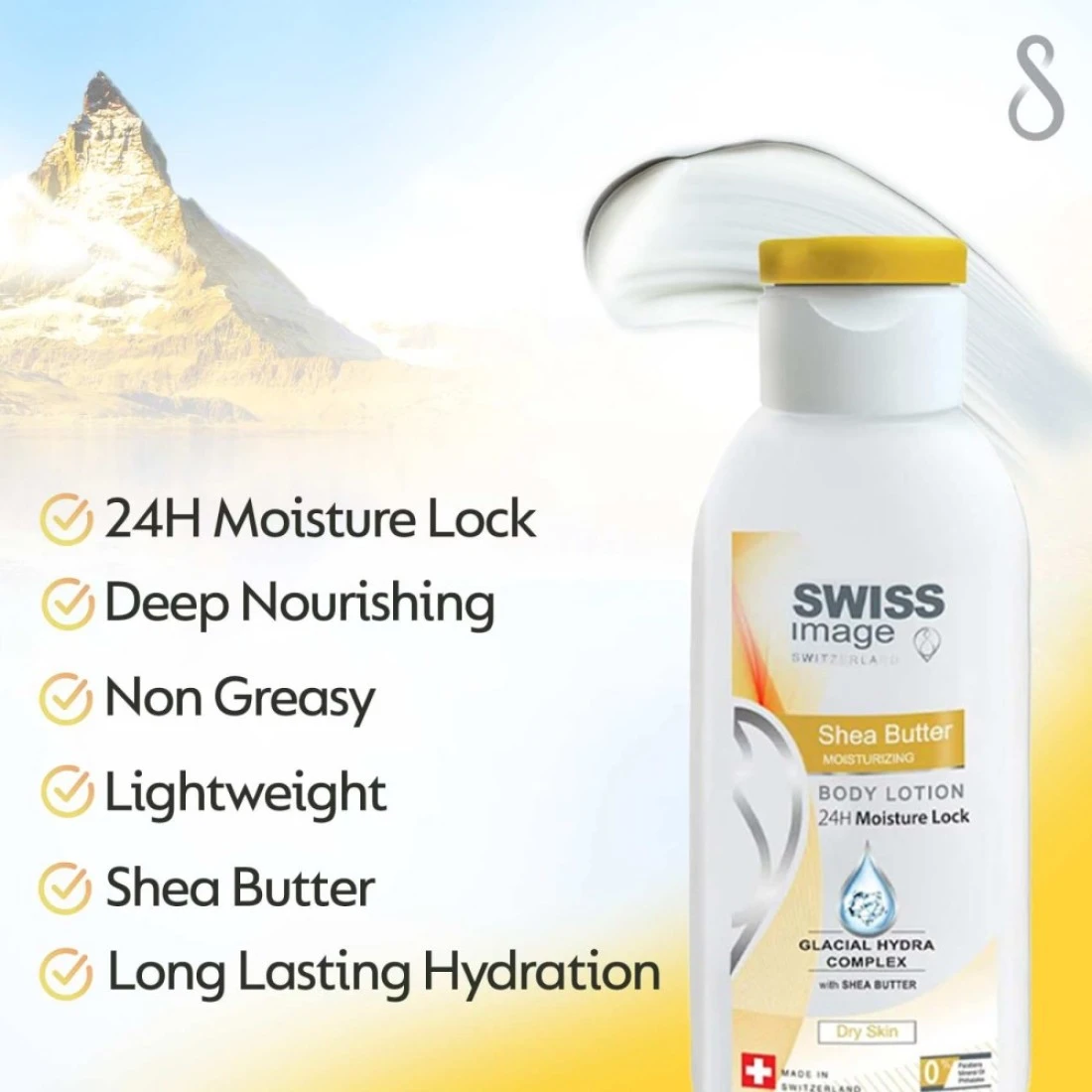 لوشن الجسم المرطب بزبدة الشيا من سويس إيمج كلير 250 ملل هو غسول مغذي ومرطب غني بزبدة الشيا. يرطب البشرة بعمق ويتركها ناعمة ونضرة. المستحضر خفيف الوزن ويمتص بسهولة في الجلد مما يوفر ترطيبا طويل الأمد. كما أنه يساعد على تحسين مرونة البشرة وثباتها. يحتوي المستحضر على تركيبة صافية غير دهنية ولا تترك أي بقايا.