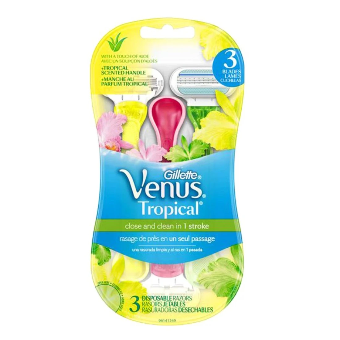 - تأتي شفرات الحلاقة جيليت فينوس تروبيكال للسيدات التي تستخدم مرة واحدة بألوان زاهية ومقابض معطرة برائحة استوائية