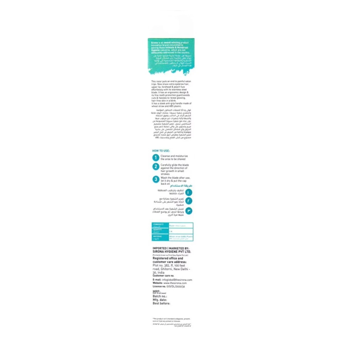 ماكينة حلاقة الوجه سيرونا للنساء عبارة عن مجموعة مكونة من 3 شفرات حلاقة عالية الجودة مصممة خصيصًا لإزالة شعر الوجه. تتميز شفرات الحلاقة هذه بشفرة حادة ودقيقة تعملل على إزالة الشعر غير المرغوب فيه من الوجه دون عناء، مما يترك البشرة ناعمة وخالية من الشعر. الحجم الصغير لماكينة الحلاقة يجعل من السهل استخدامها والمناورة حول مللامح الوجه. تضمن الحزمة المكونة من 3 قطع أن يكون لديك دائمًا ماكينة حلاقة جديدة في متناول اليد للحصول على حل سريع وفعال لإزالة الشعر.