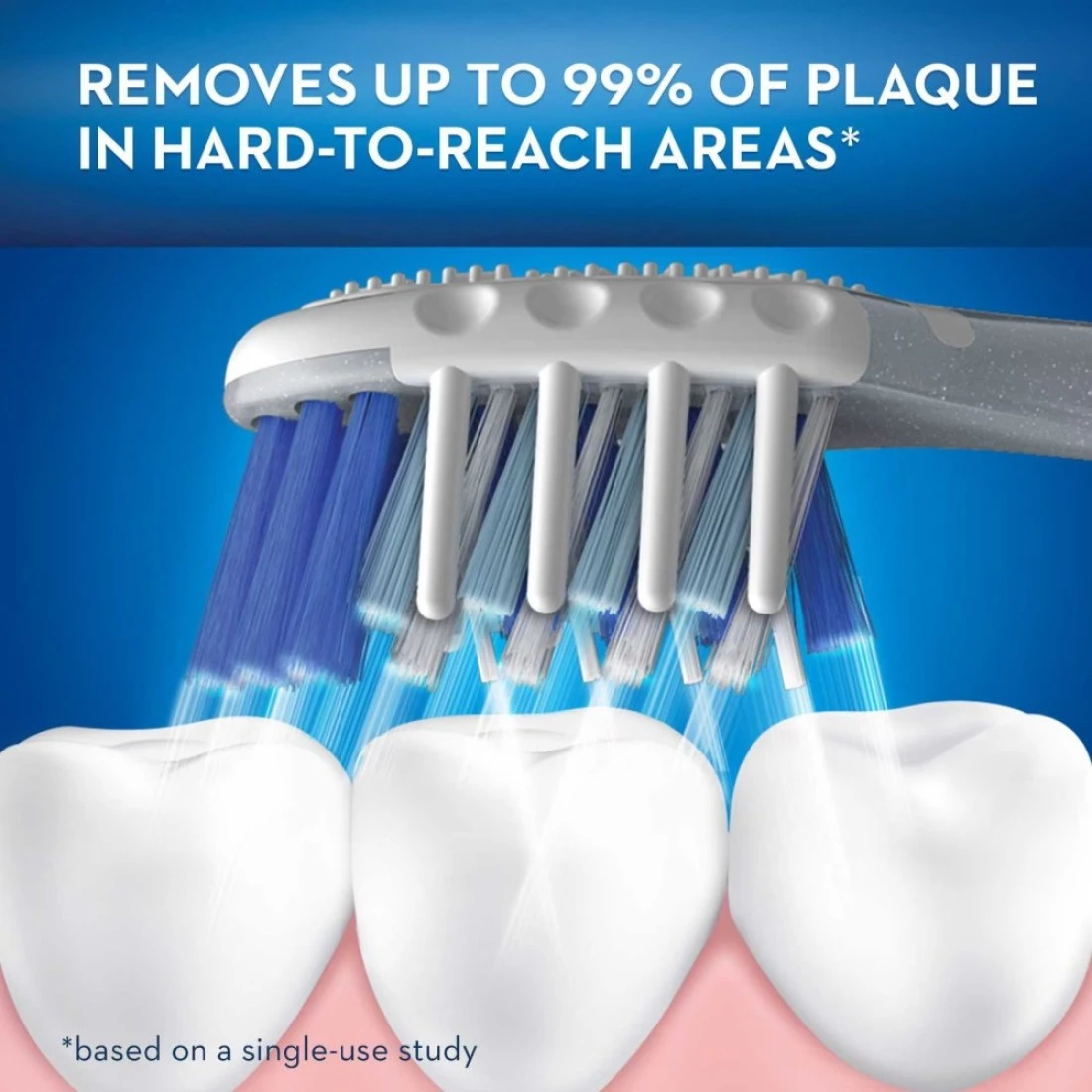 - يساعد على تنظيف المناطق التي يصعب الوصول إليها بإستخدام شعيرات باور تيب الأطول التي تتغلغل بشكل أعمق بين الأسنان