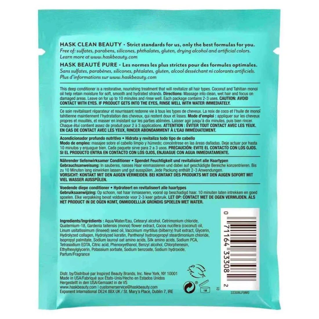 ingredients : ماء ، كحول سيتريل ، كلوريد سيتريمونيوم ، كواترنيوم -18 ، مستخلص زهرة جاردينيا تايتنسيس (مونوي) ، زيت جوز الهند ، زيت بذور الكتان ، زيت بذور التوت ، جلسرين ، كولاجين متحلل بالماء ، كيراتين متحلل ، بانثينيل هيدروكسي بروبيل ستيرديمونيوم كلوريد ، إيزوبروبيل بالميتات ، صوديوم لورويل أحماض أمينية شوفان ، أحماض أمينية سيلك ، الصوديوم ، رباعي الصوديوم ، حمض الستريك ، فينوكسي إيثانول ، كحول بنزيل ، كلورفينيسين ، إيثيل هكسوات الصوديوم عطر