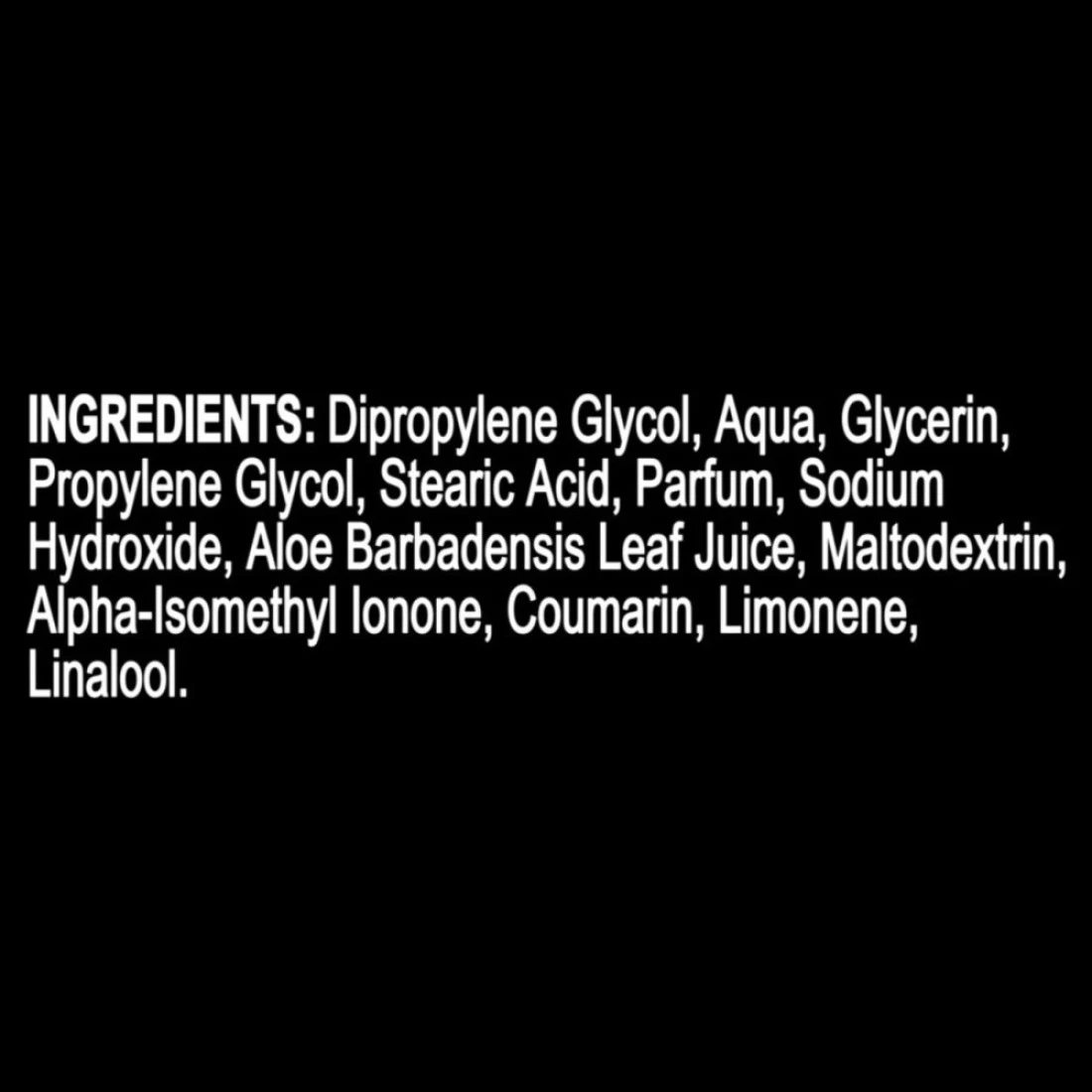 ingredients : ديبروبيلين غليكول، أكوا، غلسرين، بروبيلين غليكول، حمض دهني، عطر، هيدروكسيد الصوديوم، عصير أوراق الصبار بربادينسيس، مالتوديكسترين، ألفا إيزوميثيل لونون، كومارين، ليمونين، لينالل