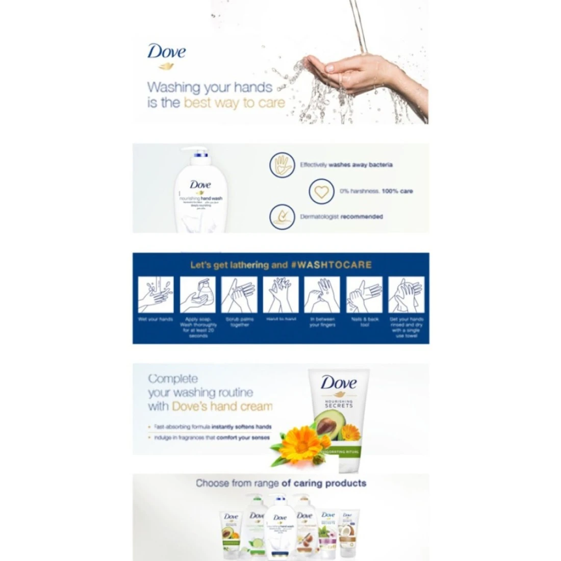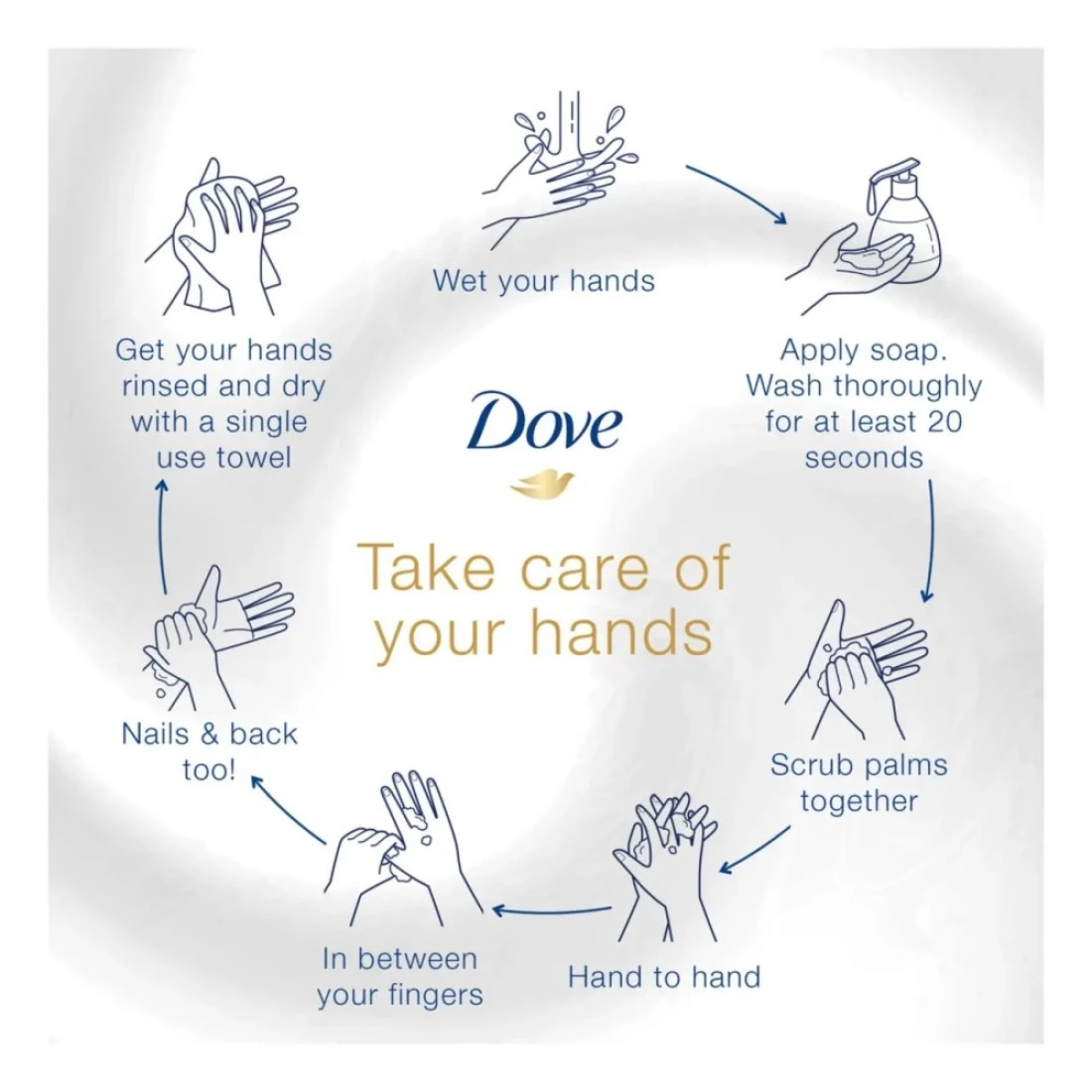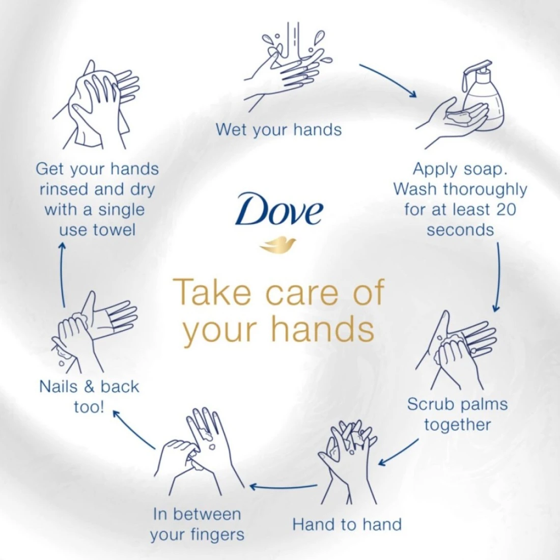 - لتحويل روتين غسل اليدين اليومي إلى عمل من أعمال الجمال لبشرتك، ما عليك سوى توزيع مضخة من غسول اليدين من دوف ضعيه على راحة يدك المبللة، ثم دلكي الرغوة الغنية على يديك قبل شطفهما جيدًا