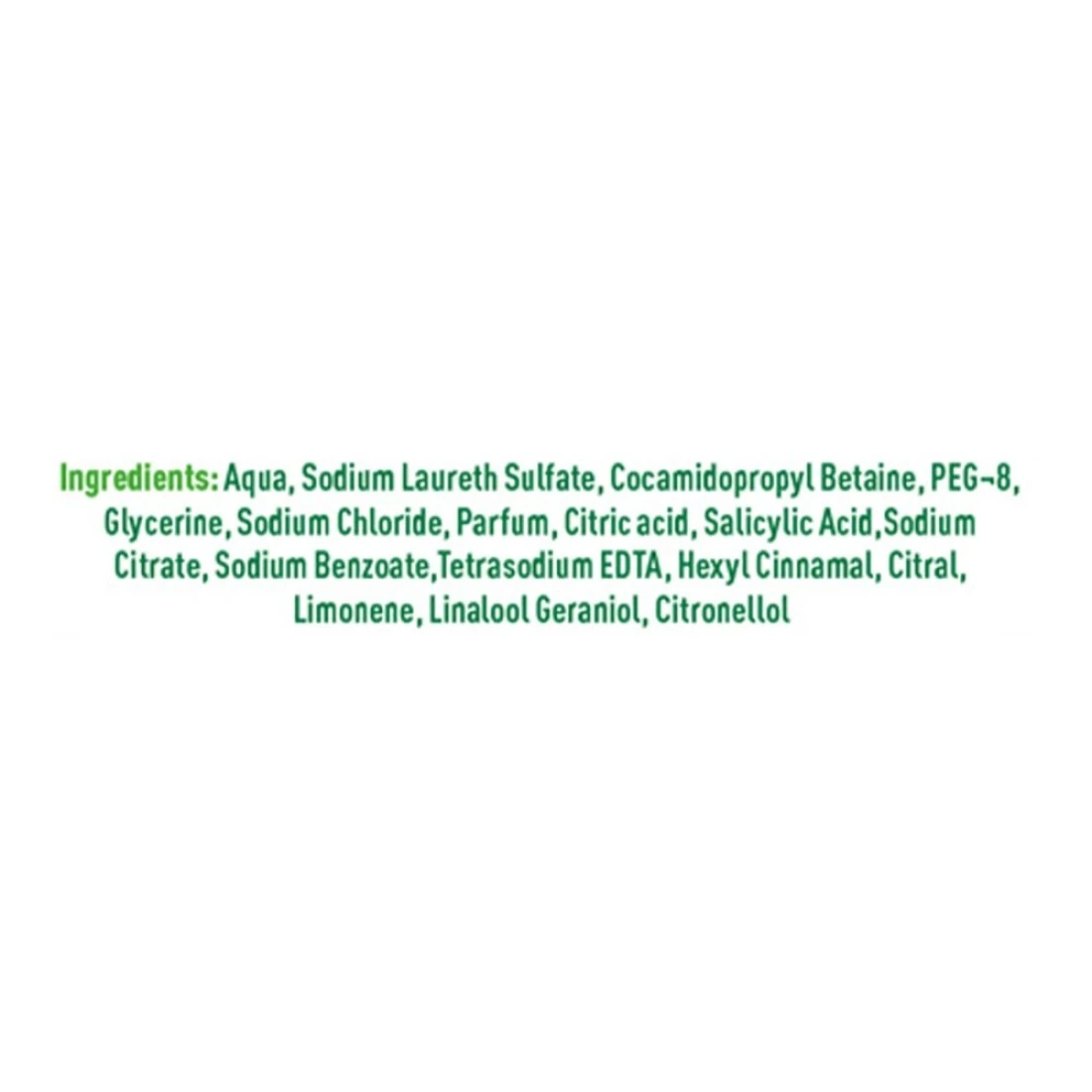 ingredients : ماء، كبريتات لوريث الصوديوم، كوكاميدوبروبيل بيتين، بولي إيثيلين غليكول-8، غلسرين، كلوريد الصوديوم، عطر، حمض الستريك، حمض الساليسيليك، سترات الصوديوم، بنزوات الصوديوم، رباعي الصوديوم، هيكسيل سينامال، سيترال، ليمونين، لينالول جيرانيول، سيترونيلول