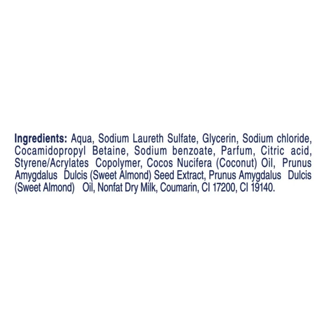 ingredients : أكوا ، كبريتات لوريث الصوديوم ، الجلسرين ، كلوريد الصوديوم ، كوكاميدوبروبيل البيتين ، بنزوات الصوديوم ، عطر ، حمض الستريك ، ستايرين / أكريلات كوبوليمر ، حليب جاف غير دسم ، أوريزا ساتيفا (أرز) مستخلص النخالة ، أوريزا ساتيفا (أرز) زيت بذرة ، زهرة نوسيفيرا مستخلص ، بنزيل ساليسيلات ، كومارين ، هيكسيل سينامال ، لينالول ، سي 17200