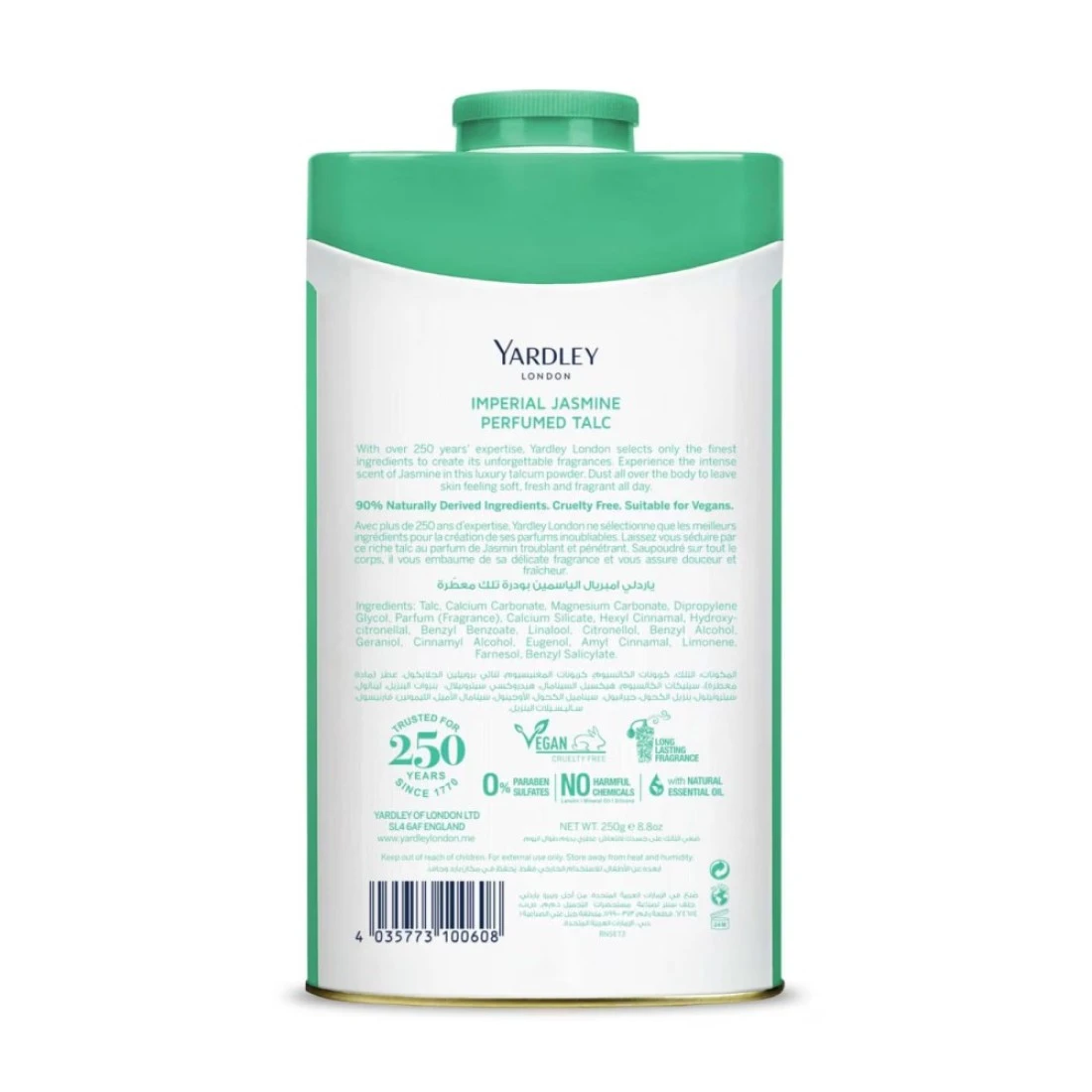 بودرة التلك بالياسمين من ياردلي لندن هي بودرة تلك فاخرة تترك بشرتك تشعر بالنعومة والرائحة الرقيقة. يتم غرس المسحوق برائحة الياسمين الساحرة المعروفة بخصائصها المهدئة. يمتص الرطوبة الزائدة ويترك بشرتك منتعشة وجافة طوال اليوم. تأتي بودرة التلك في عبوة بيضاء بحجم 200 غرام مما يجعلها مثالية للاستخدام الشخصي والهدايا.
