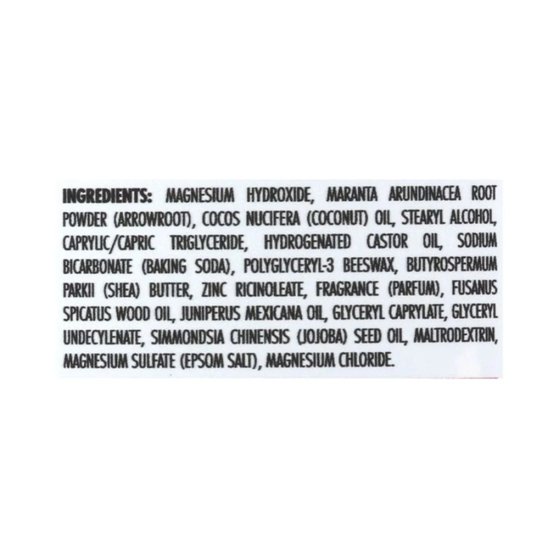 ingredients : هيدروكسيد المغنيسيوم، مسحوق جذر الأروند (الأرووت)، زيت جوز الهند (جوز النارجيل)، كحول ستيريل، ترايغليسريد الكابريليك/الكابريك، زيت الخروع المهدرج، بيكربونات الصوديوم (البيكنج صودا)، شمع العسل البولي غليسريل-3، زبدة الشيا، ريسينوليت الزنك، عطر (بارفان)، زيت خشب السنديان المسكي، زيت الجنيبرس المكسيكي، كابريلات الغليسيريل، أنديسيلينات الغليسيريل، زيت بذور الجوجوبا، مالتودكسترين، كبريتات المغنيسيوم (ملح إبسوم)، كلوريد المغنيسيوم