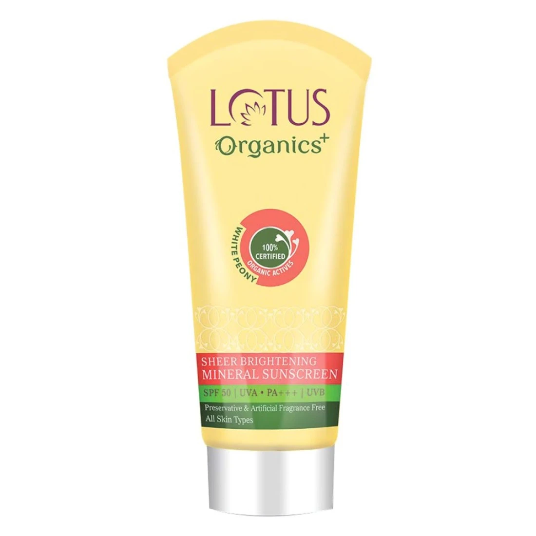 - لوتس أورجانيك + واقي شمسي معدني فاتح ومشرق ، SPF 50: تركيبة أساسها كريمي ، حماية مثالية من إشعاعات الشمس الضارة UVA / UVB