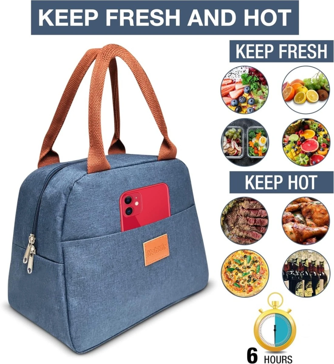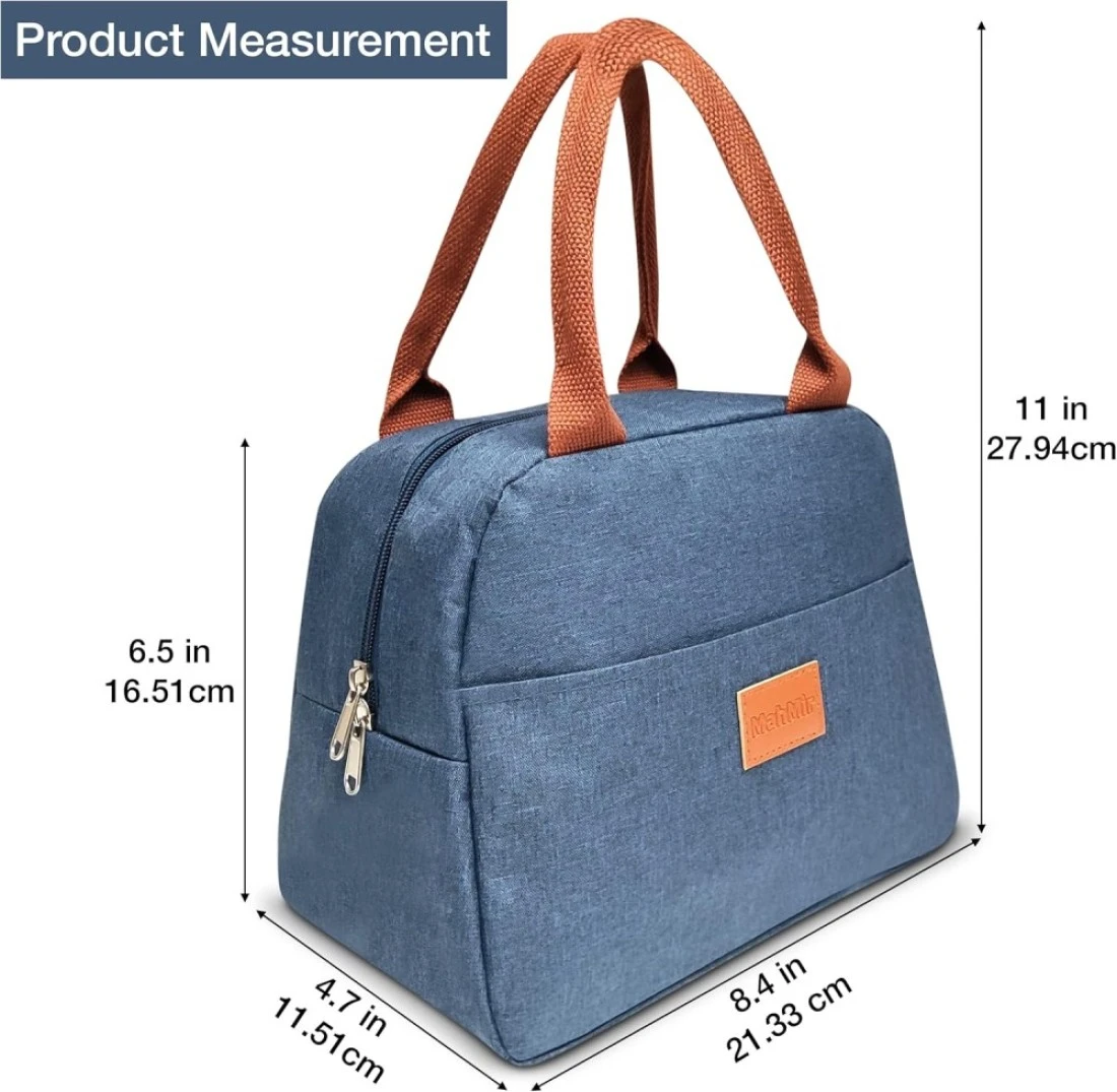 MATERIAL SAFE: 100% non-toxic, no BPA, the insulated lunch bag is made of waterproof outer layer of Oxford fabric, the inner and middle layer of insulation EPE, and interior aluminum film. The waterproof aluminum foil keeps the food cold or warm.MEDIUM CAPACITY-SIZE BAG : The 28 cm x16.5 cm x 21 cm (L*W*H) size and lightweight Insulated lunch bag is spacious enough to accommodate all the lunch needs (lunch box, canned, fruit, water bottles, snacks, etc.). This insulated lunch bag has enough space for you to carry your lunch and food for travel, office, school, picnics.ELEGANT DESIGN: This insulated lunch bag has simple and high-quality design with strong waterproof Oxford fabric, strong handles, quality double zipper, and extra front pocket. So, this insulated lunch bag looks elegant and simple in appearance, is easy to carry, is easy to open and close, gives space to keep your things like mobile, keyrings, etc. in its pocket.LONG-TERM PRESERVATION: The interior aluminum foil layer and middle layer insulation EPE keeps the warm food warm and cold food cold for maximum of 6 hours. The insulated lunch bag keeps the food and drinks fresh and preserve the temperature inside bag.MULTIFUNCTIONAL INSULATED LUNCH BAG: This bag can be used as a ice pack, lunch bag, snack bag for long trips, picnics, offices, and schools. The uni-sex design is best for women and men both.
