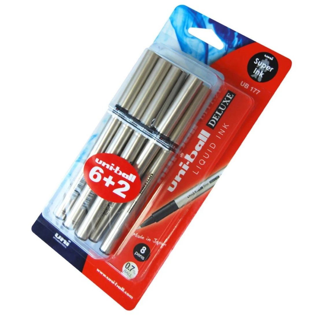 يوني بول قلم حبر سائل فاخر UB177 0.7 ملم، 8 قطع - أزرق وأسود