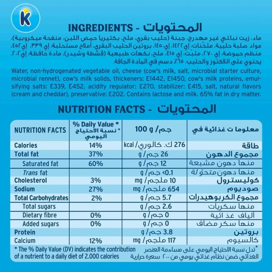 ingredients : ماء، زيت نباتي غير مهدرج، جبن (حليب بقري، ملح، بادئات التخمر ميكروبي، منفحة ميكروبية)، جوامد حليب البقر، مواد مكثفة: E1442، E1450، منظم حموضة: E270، مثبت، E415، ملح، نكهات طبيعية (كريمة وجبنة الشيدر). )، مادة حافظة: E202