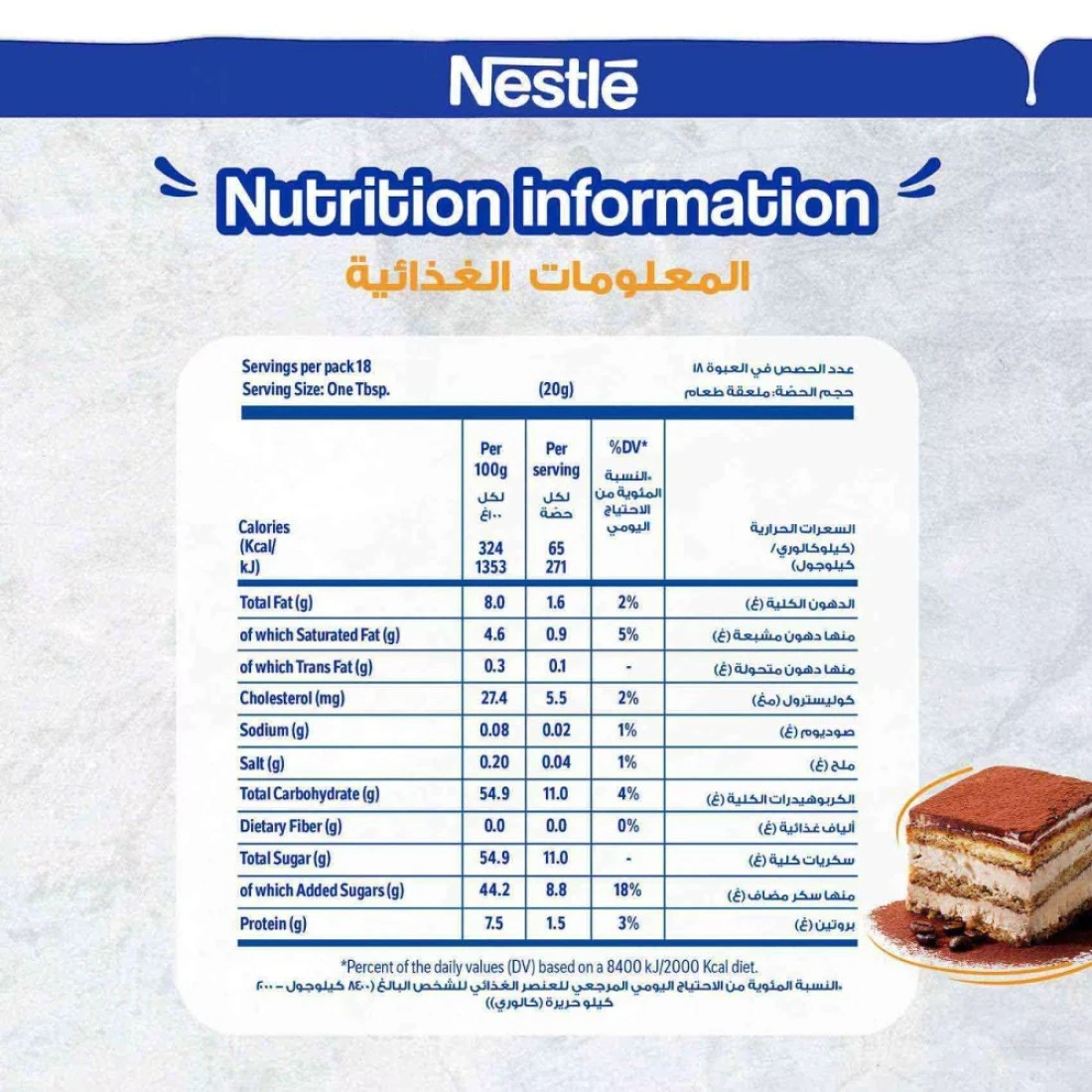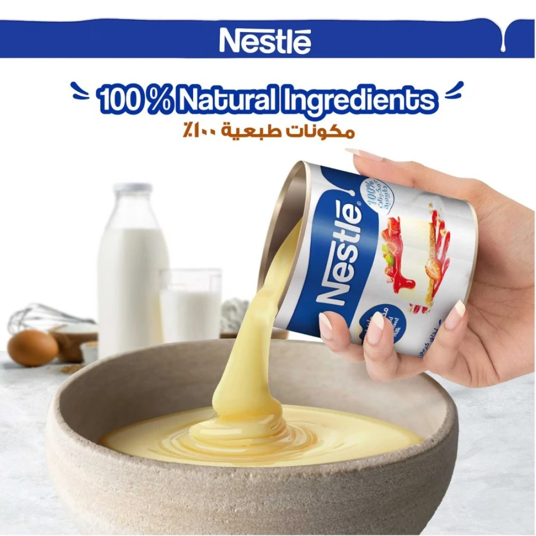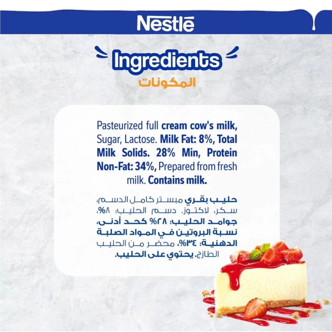 ingredients : حليب بقري كامل الدسم مبستر، مواد صلبة من الحليب، ٢٨٪ منها دهون، ٨٪ سكر. مُحضّر من حليب بقري.