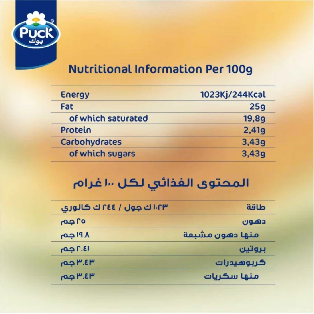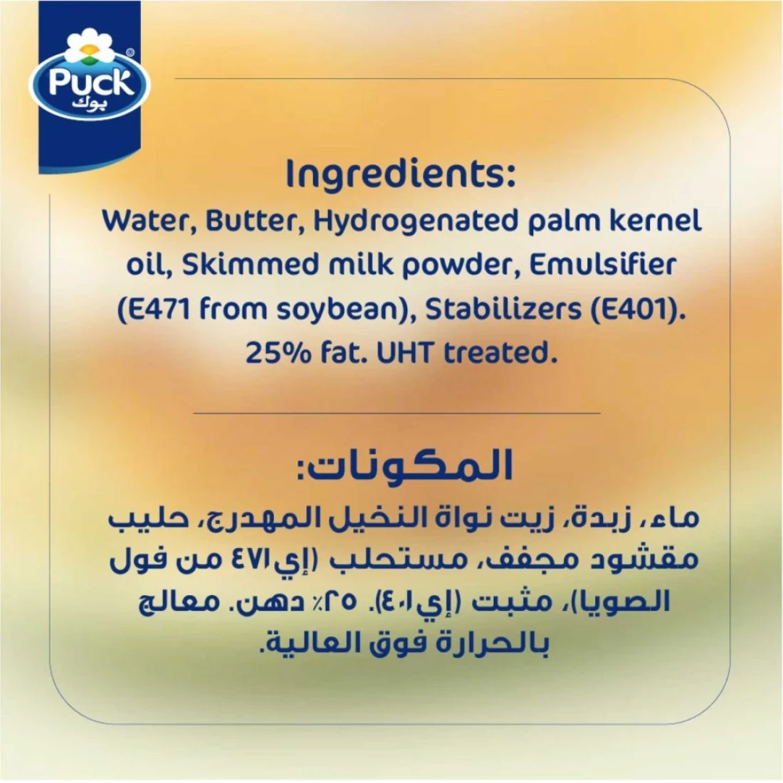 ingredients : الماء، زيت نواة النخيل، مسحوق الحليب منزوع الدسم، المستحلب (E471 من فول الصويا)، مثبتات (E401)