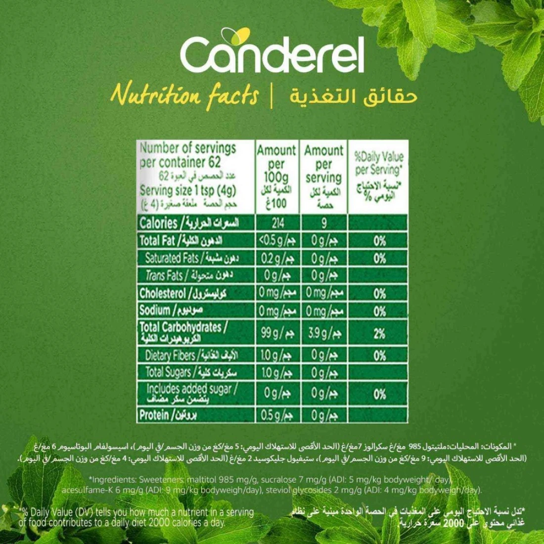 ingredients : لاكتوز (الحليب)، مُحليات: جليكوسيدات ستيفيول (5.74%)، سكرالوز (4.52%)، مثبتات: السليلوز الجريزوفولفين، كربوكسي ميثيل السليلوز الصوديوم المترابط.