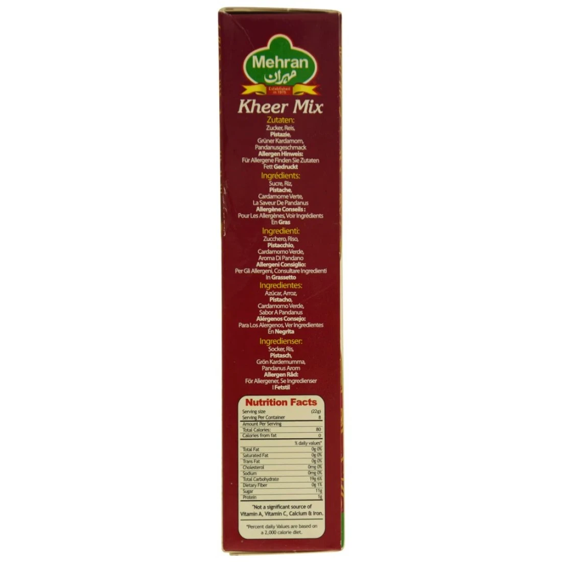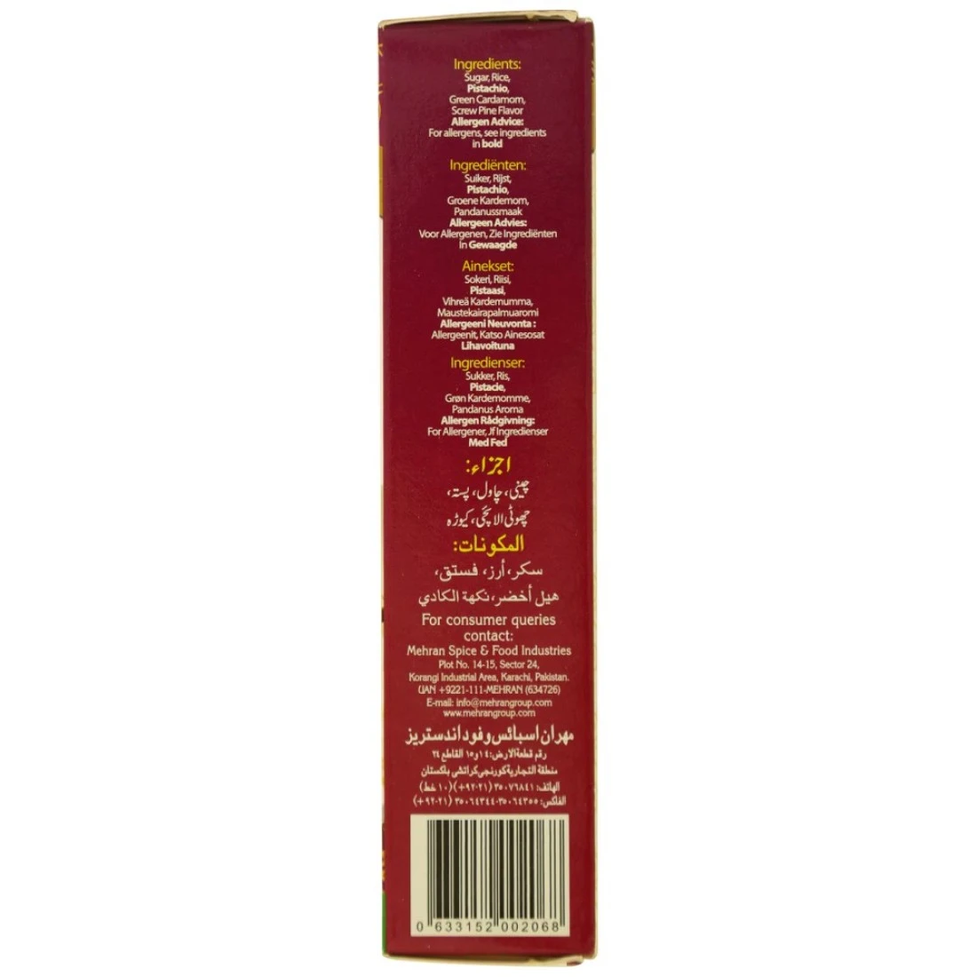 ingredients : سكر، أرز، فستق، هيل أخضر، نكهة الفستق، نصائح مسببة للحساسية: لمسببات الحساسية.