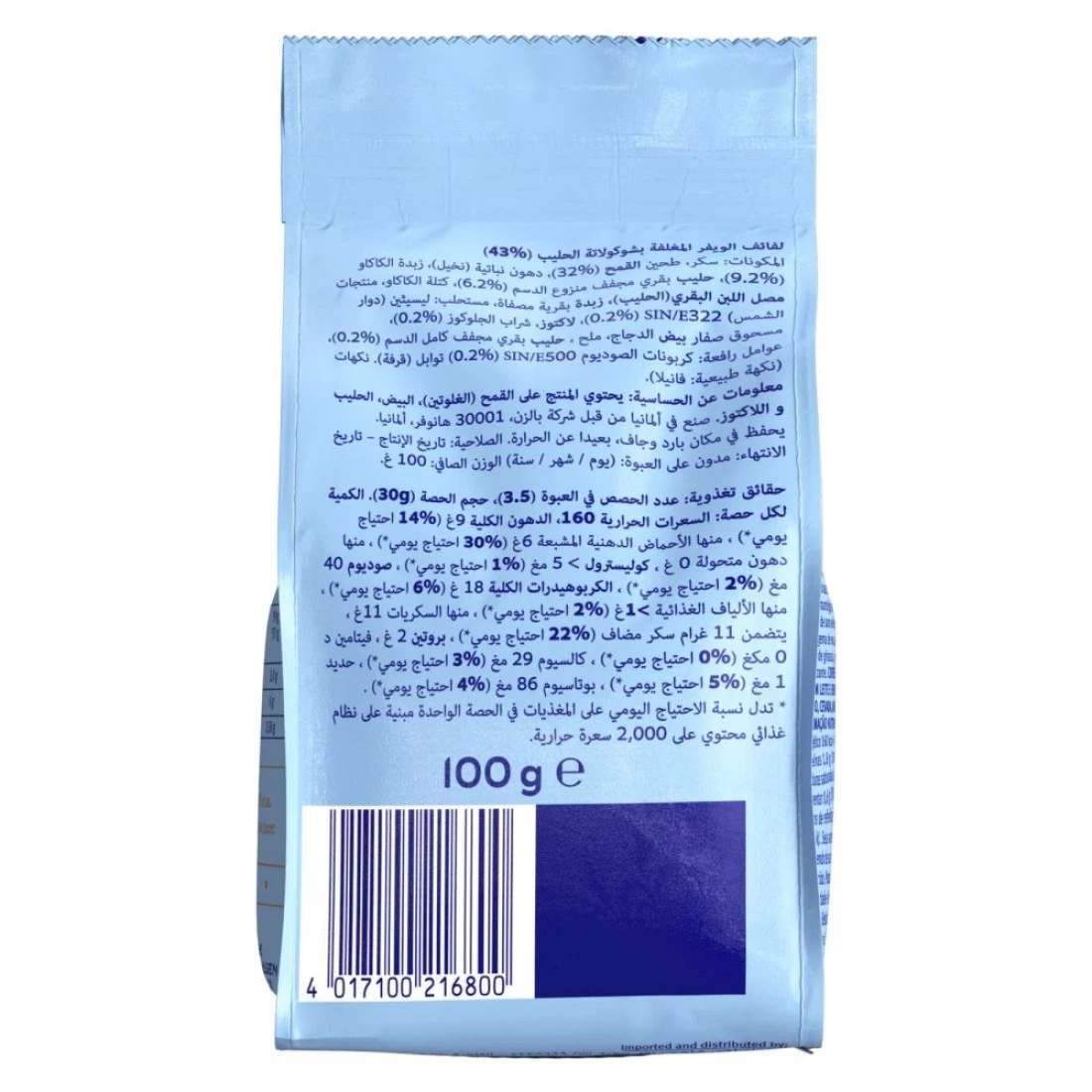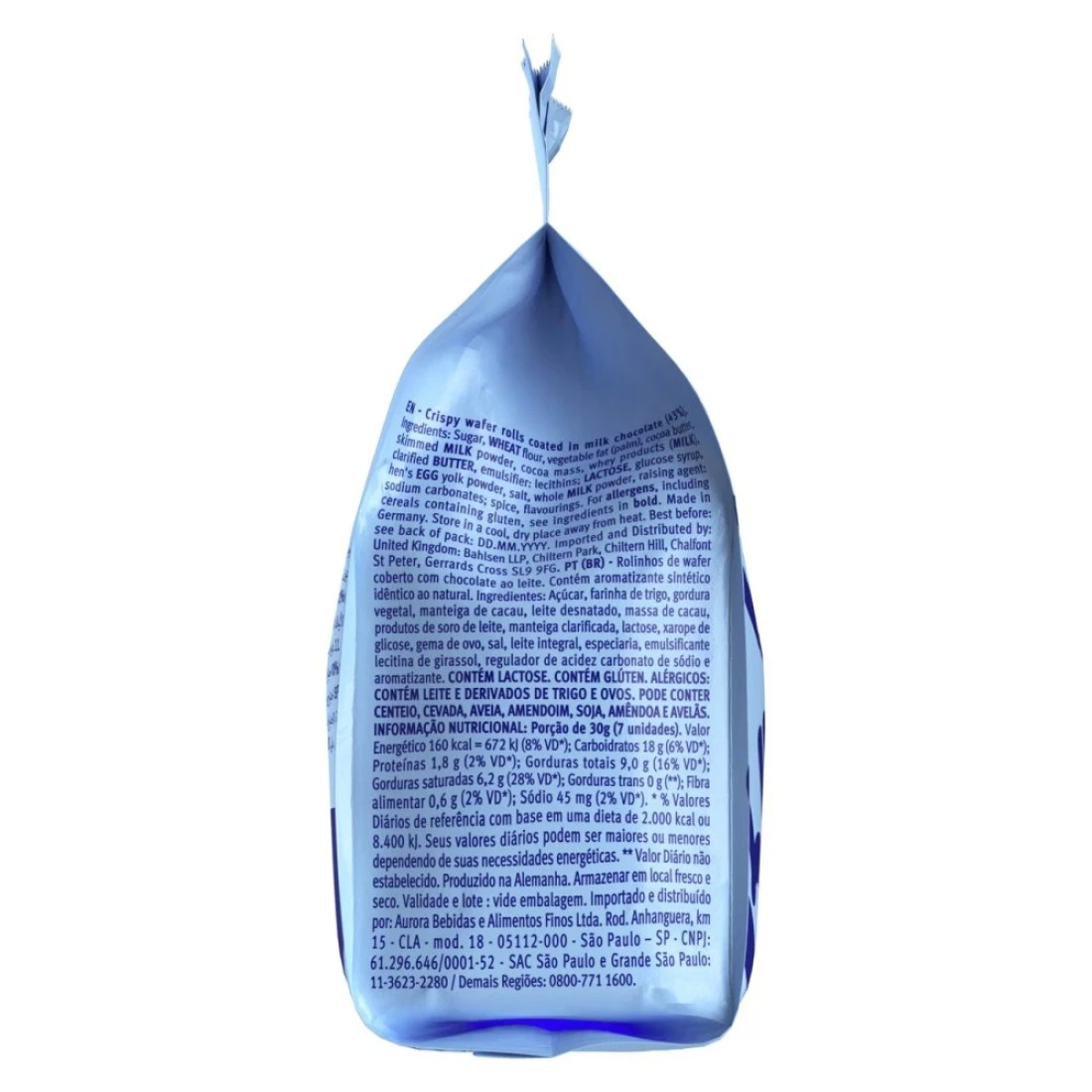 ingredients : لفائف ويفر مقرمشة مغطاة بشوكولاته الحليب (43%). المكونات: سكر، دقيق قمح، دهن نباتي (زيت نخيل)، زبدة كاكاو، مسحوق حليب خالي الدسم، كتلة كاكاو، منتجات مصل اللبن، زبدة مصفاة، مستحلب: ليسيثين، لاكتوز، شراب الجلوكوز، مسحوق صفار بيض الدجاج، ملح، مسحوق حليب كامل الدسم، عوامل رفع: كربونات الصوديوم، منكهات، توابل.