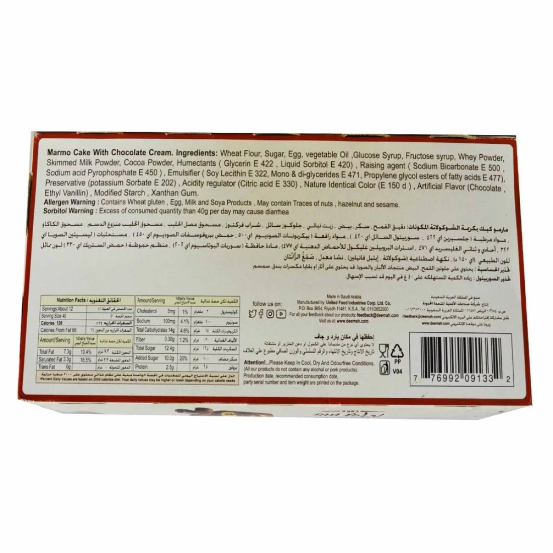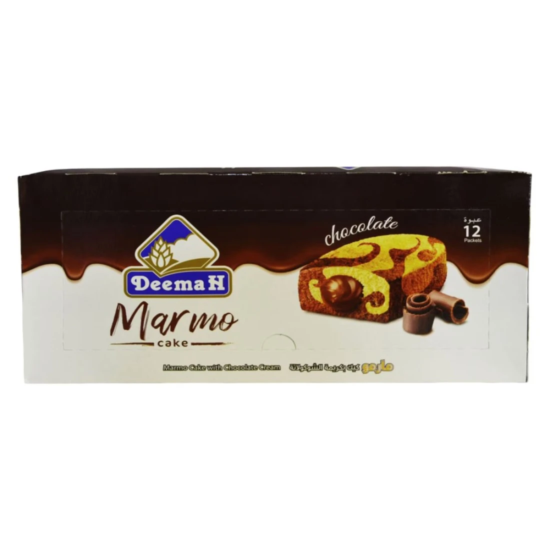 ديمه كعكة مارمو بالشوكولاته هي تحلية لذيذة تأتي في حزمة مريحة بوزن 40 غرام مكونة من 12 قطعة. مصنوعة بنكهة الشوكولاته الغنية، هذه الكعكة رطبة ولذيذة. مثالية لتناول الوجبات الخفيفة أثناء التنقل أو الإستمتاع بفنجان من القهوة، من المؤكد أن ديمه كعكة مارمو بالشوكولاته ترضي رغباتك الشديدة في تناول الحلويات.