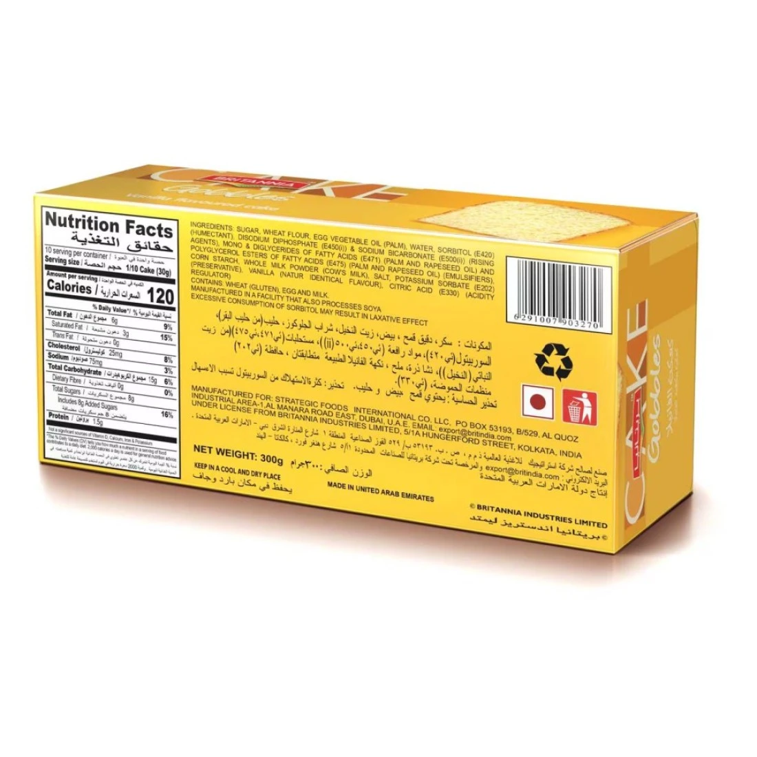 ingredients : سكر، دقيق قمح، بيض، زيت نباتي (زيت النخيل)، ماء، سوربيتول (e420) (مرطب)، ثنائي فوسفات ثنائي الصوديوم (e450(i)) وبيكربونات الصوديوم (e500(ii)) (عوامل رفع)، أحادي وثنائي غليسريد الأحماض الدهنية (e471) وإسترات بولي غليسرول الأحماض الدهنية (e475) (زيت النخيل وزيت بذور اللفت) (مستحلبات)، نشا الذرة، مسحوق حليب كامل الدسم (حليب البقر)، ملح، سوربات البوتاسيوم (e202) (مادة حافظة)، فانيليا (نكهة مطابقة للنكهة الطبيعية)، حمض الستريك (e330) (منظم حموضة)