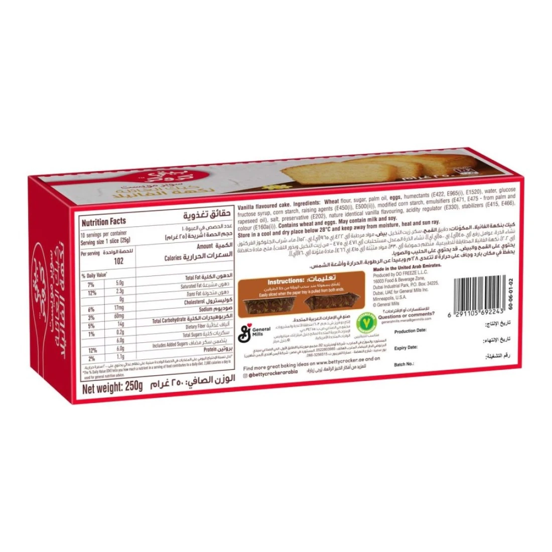ingredients : دقيق قمح، سكر، زيت نباتي (زيت النخيل)، بيض، مرطبات (e422 من زيت النخيل، E965(i)، E1520)، ماء، شراب الغلوكوز والفركتوز، نشا الذرة، عوامل رفع (e450(i)، E500)، نشا ذرة معدل (e1442)، مستحلبات (e471، E475) (من زيت النخيل وبذور اللفت)، ملح، مادة حافظة (e202)، نكهة فانيليا (مطابقة للطبيعة)، منظم حموضة (e330)، مثبتات (e415، E466)، لون (e160a(i))