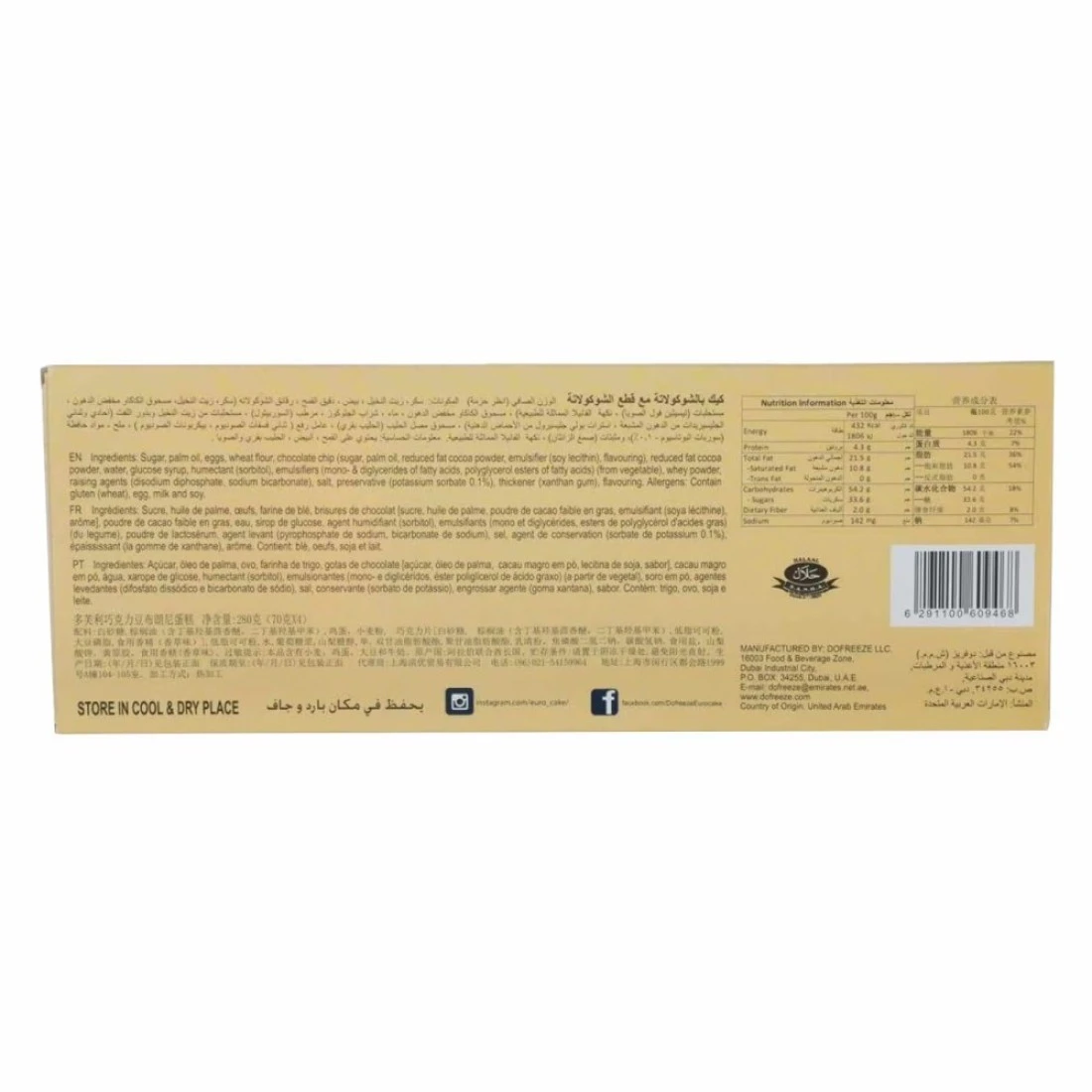 ingredients : سكر، زيت النخيل، بيض، دقيق قمح، رقائق شوكولاطه (سكر، زيت النخيل، مسحوق كاكاو قليل الدسم، مستحلب (ليسيثين الصويا)، نكهة)، مسحوق كاكاو قليل الدسم، ماء، شراب الغلوكوز، مرطب (سوربيتول 1.4 غرام)، مستحلبات (أحادي وثنائي غليسريد الأحماض الدهنية، إسترات بولي غليسرول الأحماض الدهنية) (من نباتي)، مسحوق مصل اللبن، عوامل رفع (ثنائي فوسفات ثنائي الصوديوم، بيكربونات الصوديوم)، ملح، مادة حافظة (سوربات البوتاسيوم 0.1%)، مكثف (صمغ زانثان) ونكهة.
