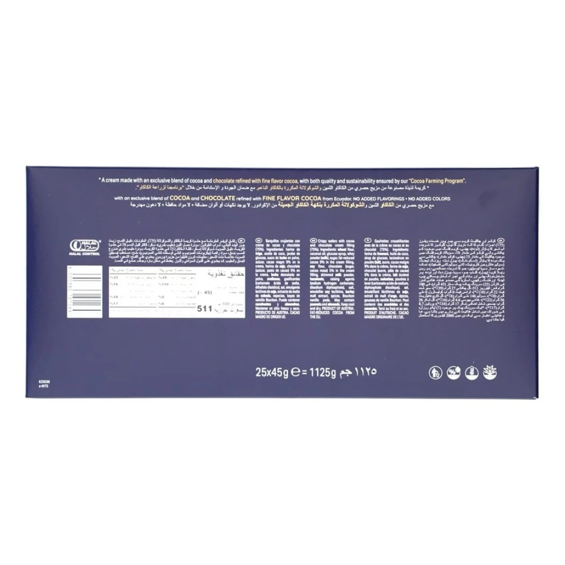 ingredients : دقيق القمح، زيت جوز الهند، شراب الجلوكوز، مسحوق مصل اللبن (حليب)، سكر، كاكاو قليل الدسم 9% في حشوة الكريمة، دقيق الصويا، شوكولاتة (سكر، كتلة كاكاو) 5% في حشوة الكريمة، مسحوق حليب خالي الدسم، بندق، عوامل رفع (كربونات هيدروجين الصوديوم، ثنائي فوسفات ثنائي الصوديوم)، ملح، مستحلب ليسيثين الصويا، مستخلص الشعير، توابل، قرون فانيليا بوربون