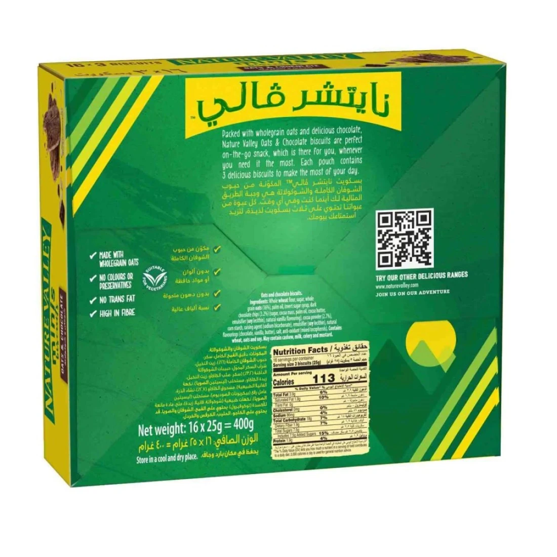 بسكويت الشوفان والشوكولاطه من ناتشر فالي هو خيارٌ لذيذٌ وعمليٌّ للوجبات الخفيفة. تحتوي كل عبوة على 16 بسكويتة مغلفة بشكلٍ فردي، مما يجعلها مثاليةً لتناولها أثناء التنقل. هذه البسكويت مصنوعة من الشوفان الكامل ومغطاة بطبقةٍ غنيةٍ من الشوكولاطه. تُقدم هذه البسكويت متعةً مُرضيةً وغنيةً بالألياف. استمتع بهذه البسكويت اللذيذة كوجبةٍ سريعةٍ مُنعشةٍ أو كإضافةٍ لذيذةٍ إلى حقيبة غداءك.