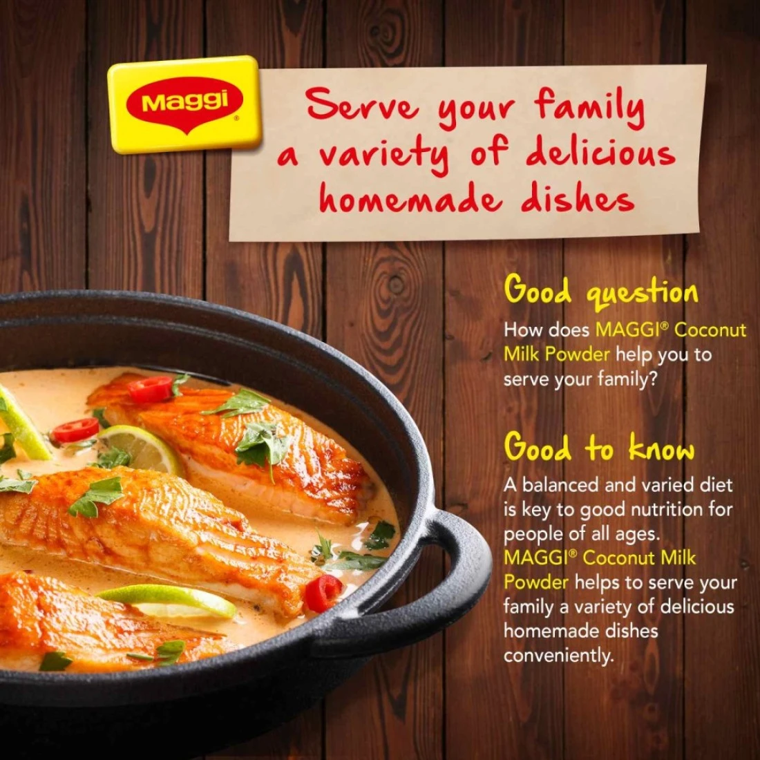 لم يعد عليك أن تكافح من أجل كشط جوز الهند وعصره وطحنه لاستخراج حليب جوز الهند الطازج لتحضير أطباقك التايلاندية والهندية اللذيذة. تقدم لك ماجي، علامتك التجارية المفضلة، حليب جوز الهند في صورة مسحوق غير ألباني لا يتطلب أي جهد تقريبًا للحصول على حليب جوز الهند الغني، بسرعة وسهولة. مسحوق حليب جوز الهند سهل الاستخدام ومثالي للكاري والأرز والكعك والحلوى والطواجن والبسكويت وتحضيرات المشروبات بالخلاط. يضفي مسحوق جوز الهند قوامًا كريميًا غنيًا عند استخدامه في هذه الأطباق.