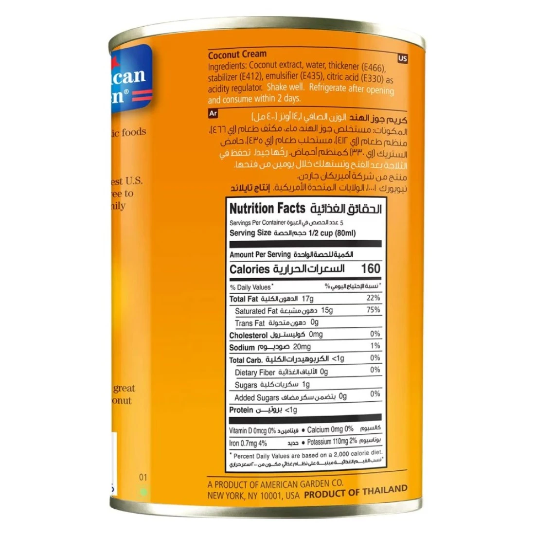 كريمة جوز الهند من أمريكان جاردن، سعة 400 ملل، تُضفي نكهةً كريميةً مميزةً على أطباقك أو مشروباتك المفضلة، وهي مثالية لتحضير الكاري اللذيذ والشوربات الكريمية والحلويات الشهية والأطباق النباتية والمشروبات المنعشة. تُضفي كريمة جوز الهند هذه نكهةً غنيةً ونكهةً أصيلةً على أطباقك. مُعبأةٌ بشكل مريح في علبة لحفظ النكهة مع سهولة التخزين والاستخدام. حسّن مذاق وجباتك وفاجئ عائلتك أو ضيوفك بوجبة منزلية شهية مع كريمة جوز الهند من أمريكان جاردن. كما أنها لذيذةٌ في الحلويات والأطباق الحلوة مثل الفطائر والبودينغ. تُقدم لكم أمريكان جاردن أطعمةً عالية الجودة من الولايات المتحدة الأمريكية وحول العالم. مجموعتنا الواسعة من الأطعمة الأصيلة مثاليةٌ للمشاركة مع الأصدقاء والعائلة.