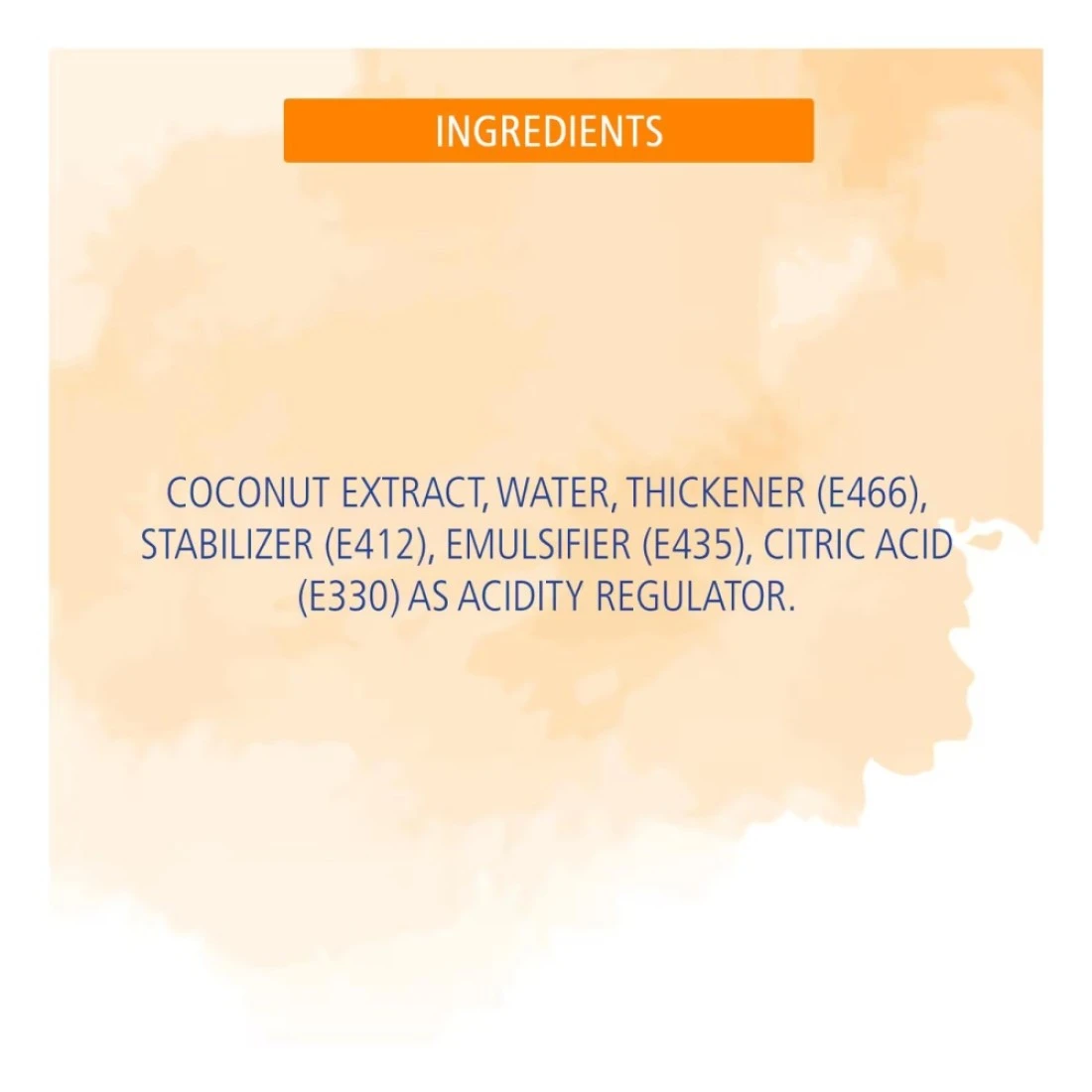 ingredients : مستخلص جوز الهند، ماء، مُكثِّف (E466)، مُثبِّت (E412)، مُستحلب (E435)، حمض الستريك (E330) كمُنظِّم للحموضة