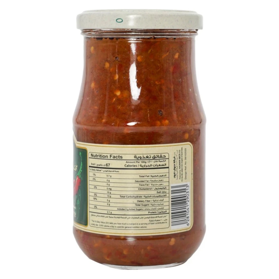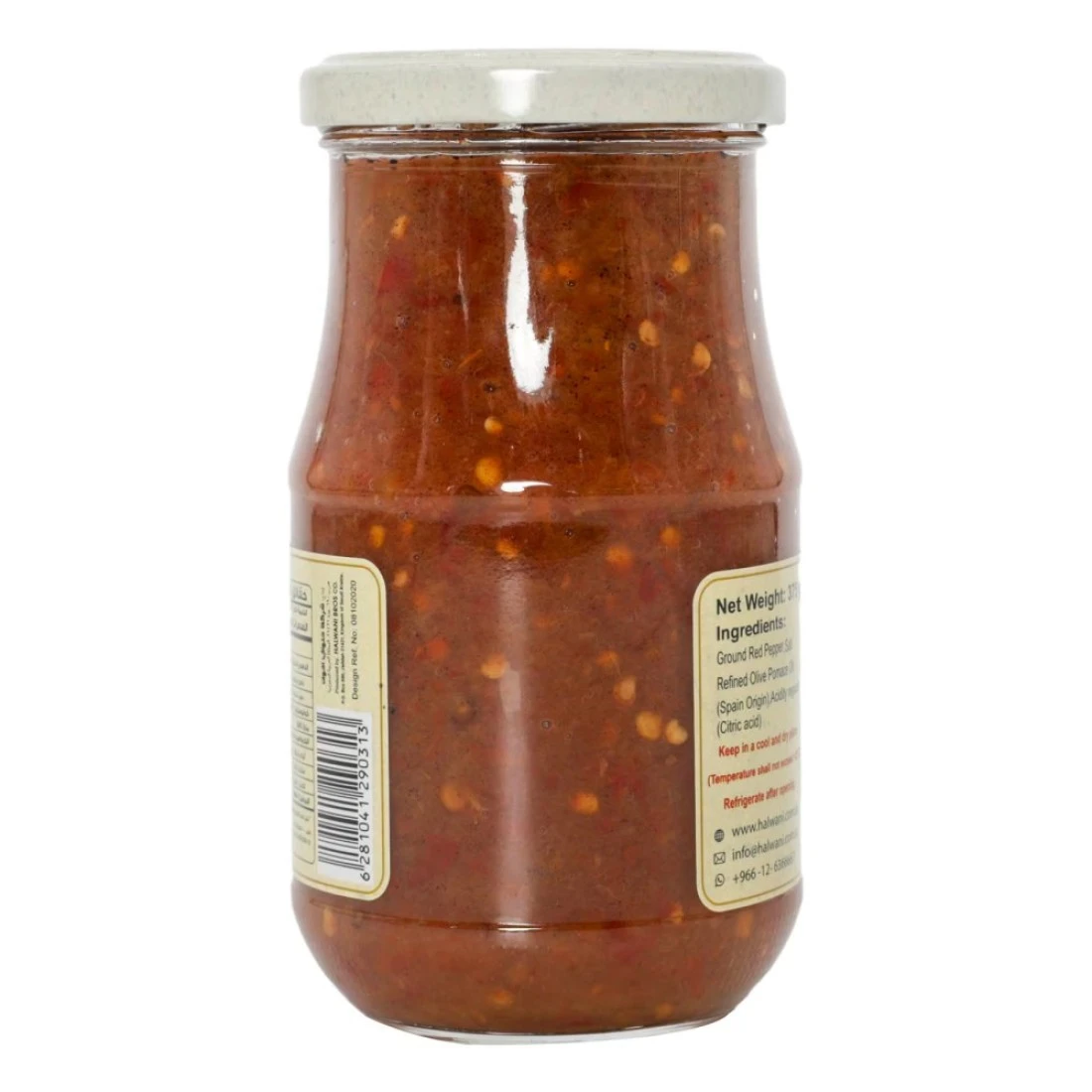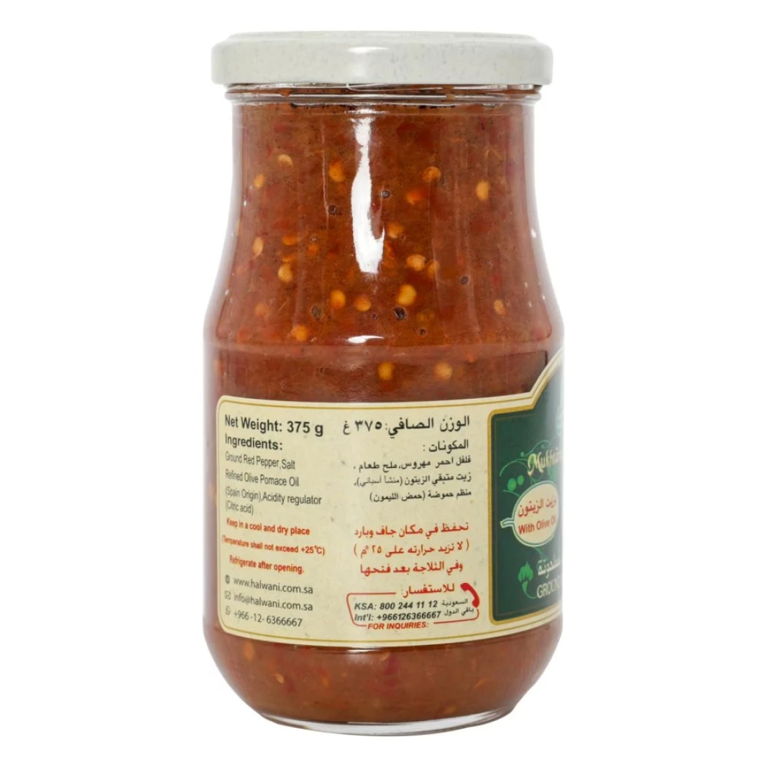 ingredients : فلفل أحمر مطحون، ملح، زيت ثفل الزيتون المكرر، زيت زيتون بكر ممتاز (أصل إسباني)، مادة حافظة E211