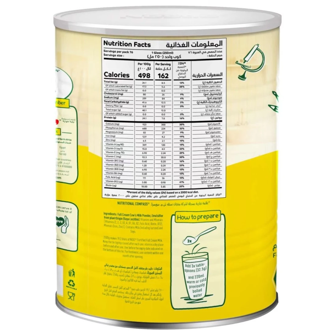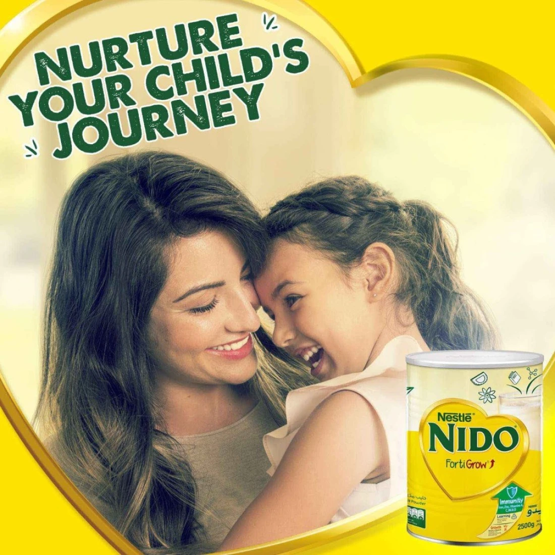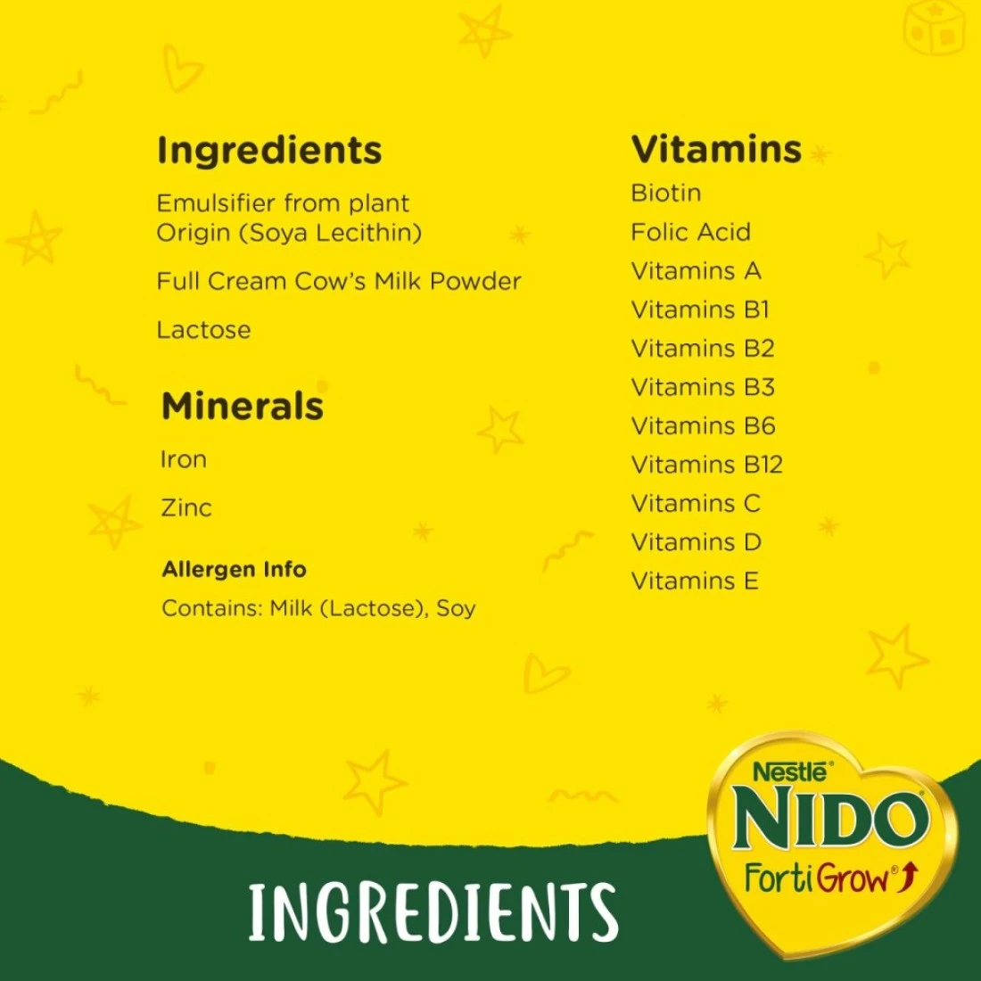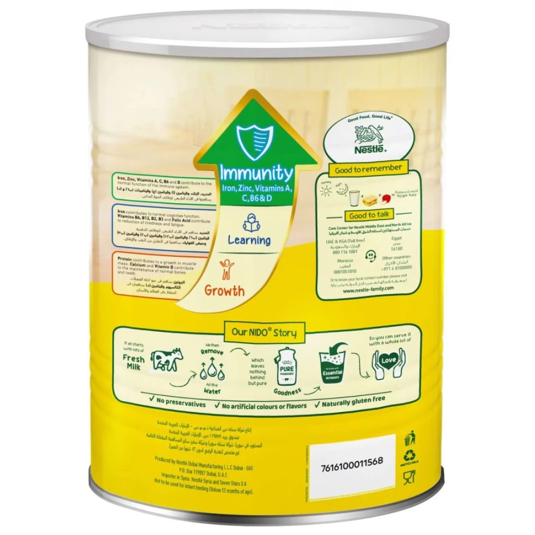 - ملف غذائي غني: حليب نستله نيدو المدعم مليء بالفيتامينات والمعادن الأساسية، بما في ذلك فيتامين أ، د، ج، ب1، ب2، ب3، ب6، ب12، والحديد، لدعم النمو والتطور الشامل