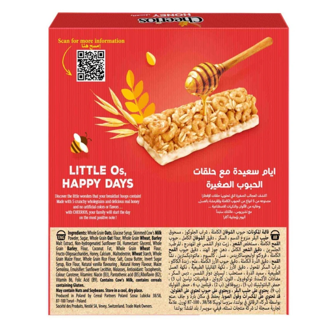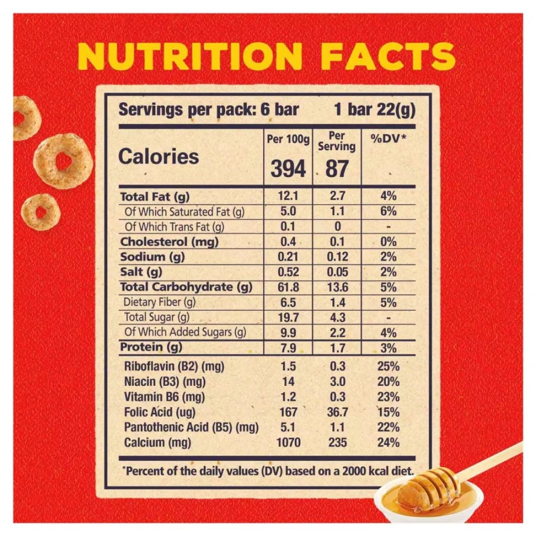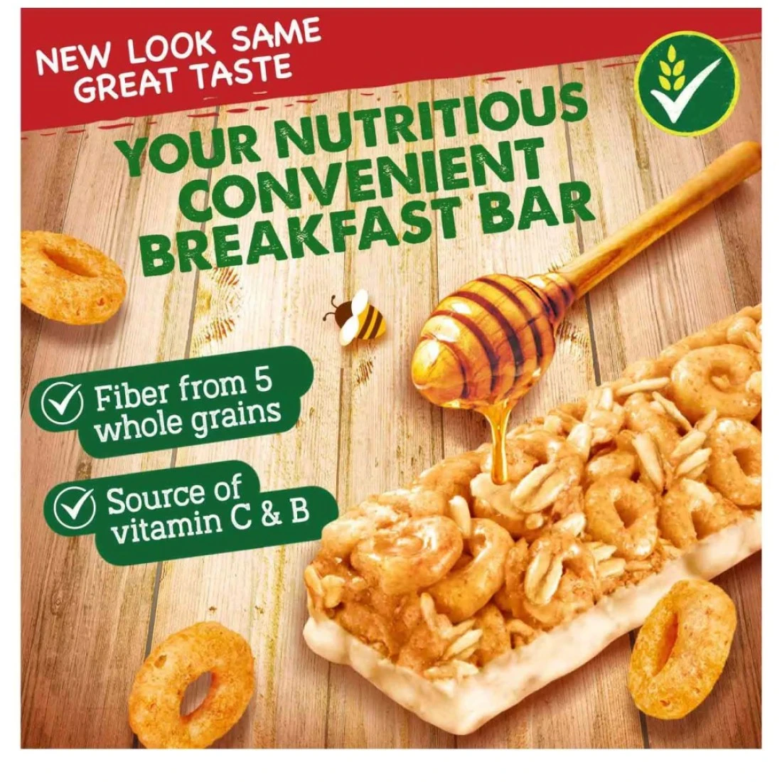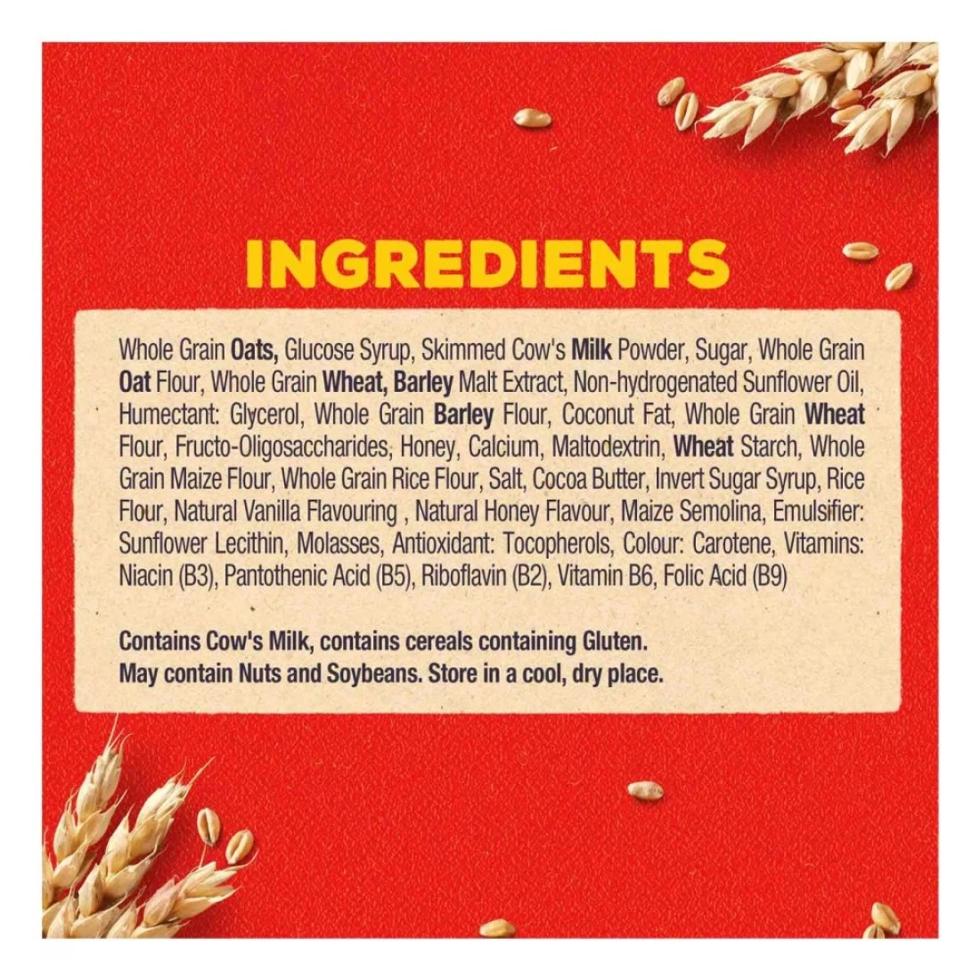 ingredients : حبوب (73.8%) [(دقيق شوفان كامل الحبة (26.7%) (يحتوي على جلوتين)، قمح كامل الحبة (26.7%)، دقيق شعير كامل الحبة (16.4%)، دقيق ذرة كامل الحبة (2.0%)، دقيق أرز كامل الحبة (2.0%)]، سكر، نشا قمح (يحتوي على جلوتين)، عسل (3.9%)، شراب سكر بني مقلوب جزئيًا، ملح، منظم حموضة: فوسفات ثلاثي البوتاسيوم، نكهة: نكهة عسل اصطناعية، مضاد أكسدة: توكوفيرول، ألوان: مستخلص أناتو. فيتامين ج، نياسين، حمض البانتوثينيك، ريبوفلافين (ب2)، فيتامين ب6، حمض الفوليك، فيتامين د، كربونات الكالسيوم، حديد.