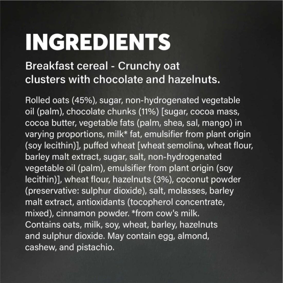 ingredients : شوفان مطحون (51%)، سكر، زيت نباتي (نخيل)، قطع شوكولاتة بيضاء (6%) [سكر، زبدة كاكاو، مسحوق حليب كامل الدسم، مسحوق حليب خالي الدسم، مستحلب من أصل نباتي (ليسيثين دوار الشمس)]، قمح منفوخ [سميد قمح، دقيق قمح، مستخلص مالت الشعير، سكر، ملح، زيت نباتي (نخيل)، مستحلب من أصل نباتي (ليسيثين الصويا)]، دقيق قمح، فستق (396)، مسحوق جوز الهند (يحتوي على كبريتيت)، دبس السكر، ملح، مستخلص مالت الشعير، مضادات أكسدة (ألفا توكوفيرول، بالميتات أسكوربيل)، مسحوق قرفة