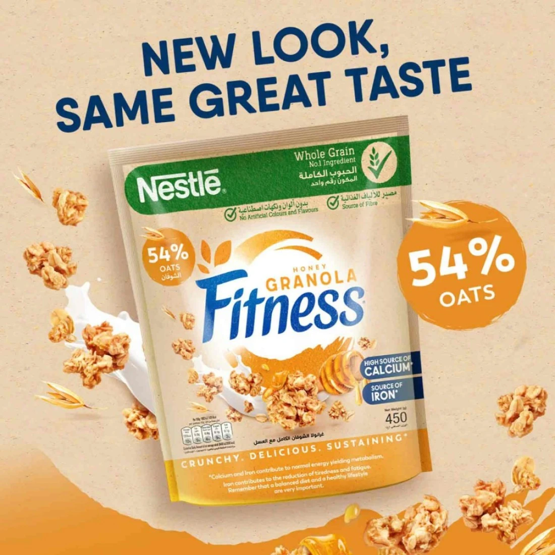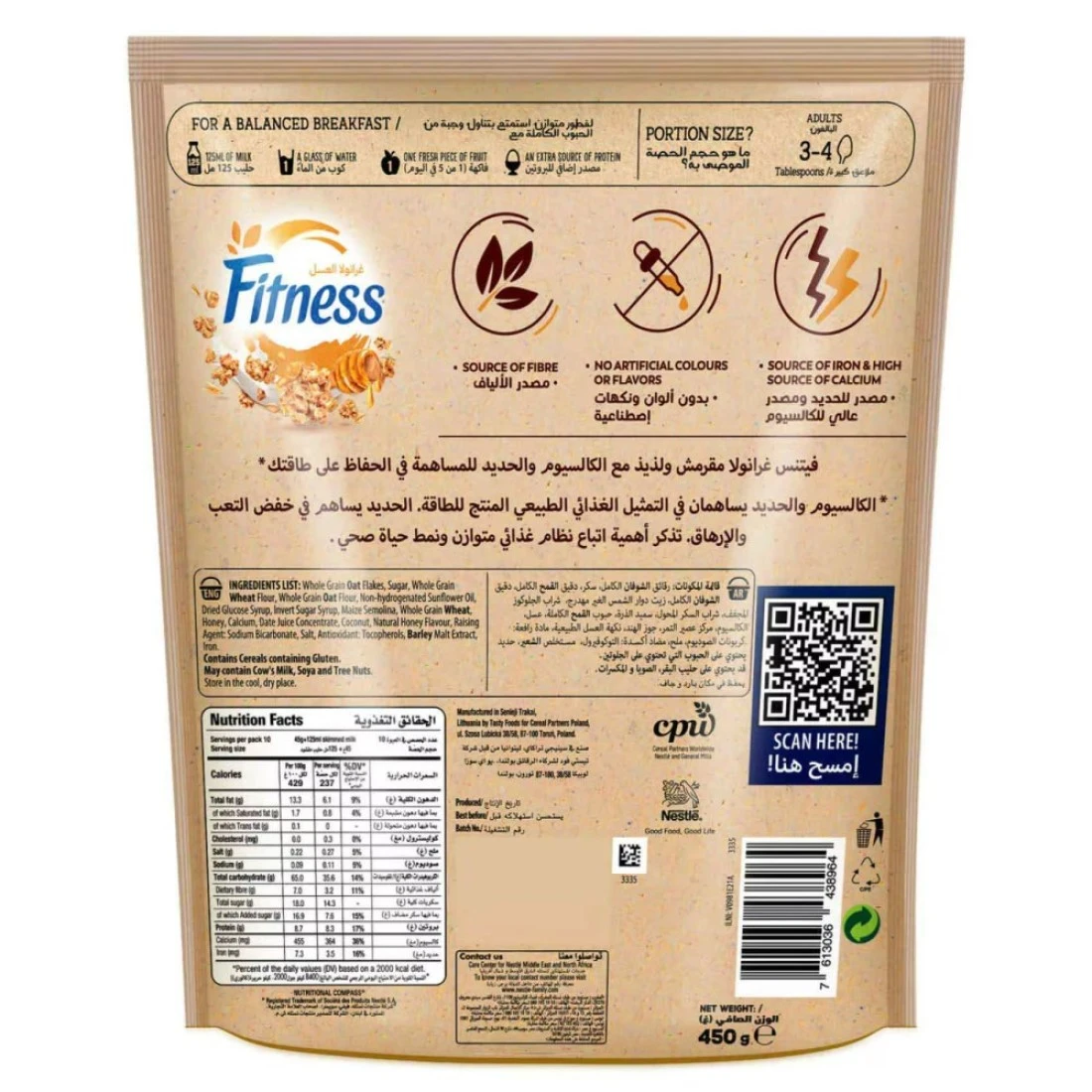 نستله فيتنس جرانولا وشوفان بالعسل ٤٥٠ غرام هي حبوب صحية غنية بالجرانولا المقرمشة اللذيذة بنكهة العسل، والزبيب العصير، والشوفان الكامل. إنها مصدر غني بالفيتامينات والمعادن الأساسية، غنية بالألياف وقليلة الدهون. تمنحك هذه الحبوب الطاقة اللازمة للحفاظ على نشاطك، وتساعدك على بدء يومك بنشاط وحيوية.