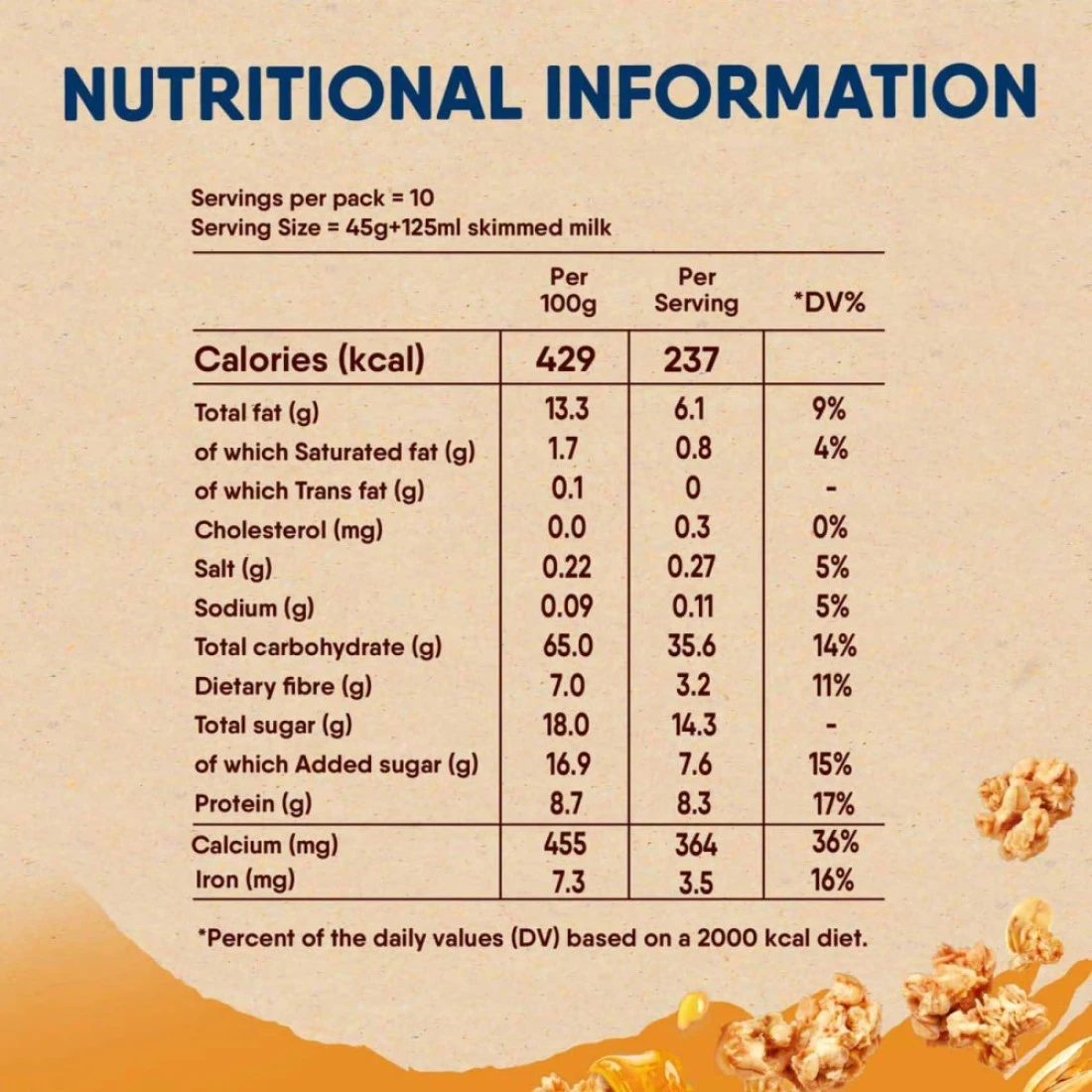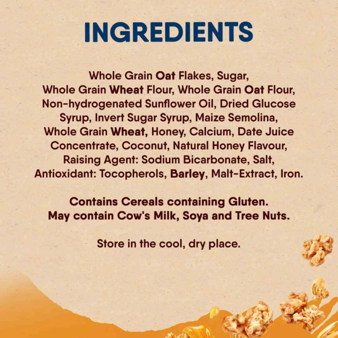 ingredients : حبوب (رقائق الشوفان الكاملة (58.4%) (تحتوي على الغلوتين)، دقيق الشوفان الكامل (2.9%) (يحتوي على الغلوتين)، سكر، رقائق القمح (قمح (9.2%) (تحتوي على الغلوتين)، مستخلص الشعير (يحتوي على الغلوتين)، مستحلب من أصل نباتي: ليسيثين دوار الشمس)