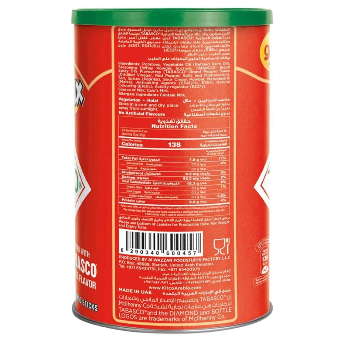 أصابع البطاطس بصلصة الفلفل تاباسكو من كيتكو ستيكس هي وجبة خفيفة لذيذة وحارة تجمع بين النكهات القوية لصلصة الفلفل تاباسكو الحارة وأصابع البطاطس المقرمشة. كل حزمة 45 غرام مليئة بأصابع البطاطس المقرمشة الممزوجة بنكهة صلصة الفلفل تاباسكو المميزة واللذيذة. تقدم هذه الوجبات الخفيفة قرمشة مُرضية ونكهة حارة مميزة، مثالية لمن يستمتعون بنكهة حارة. سواء كنت ترغب في إضافة بعض التوابل إلى وجباتك الخفيفة أو كنت من محبي صلصة تاباسكو، فإن أصابع البطاطس هذه ستلبي رغباتك بالتأكيد.