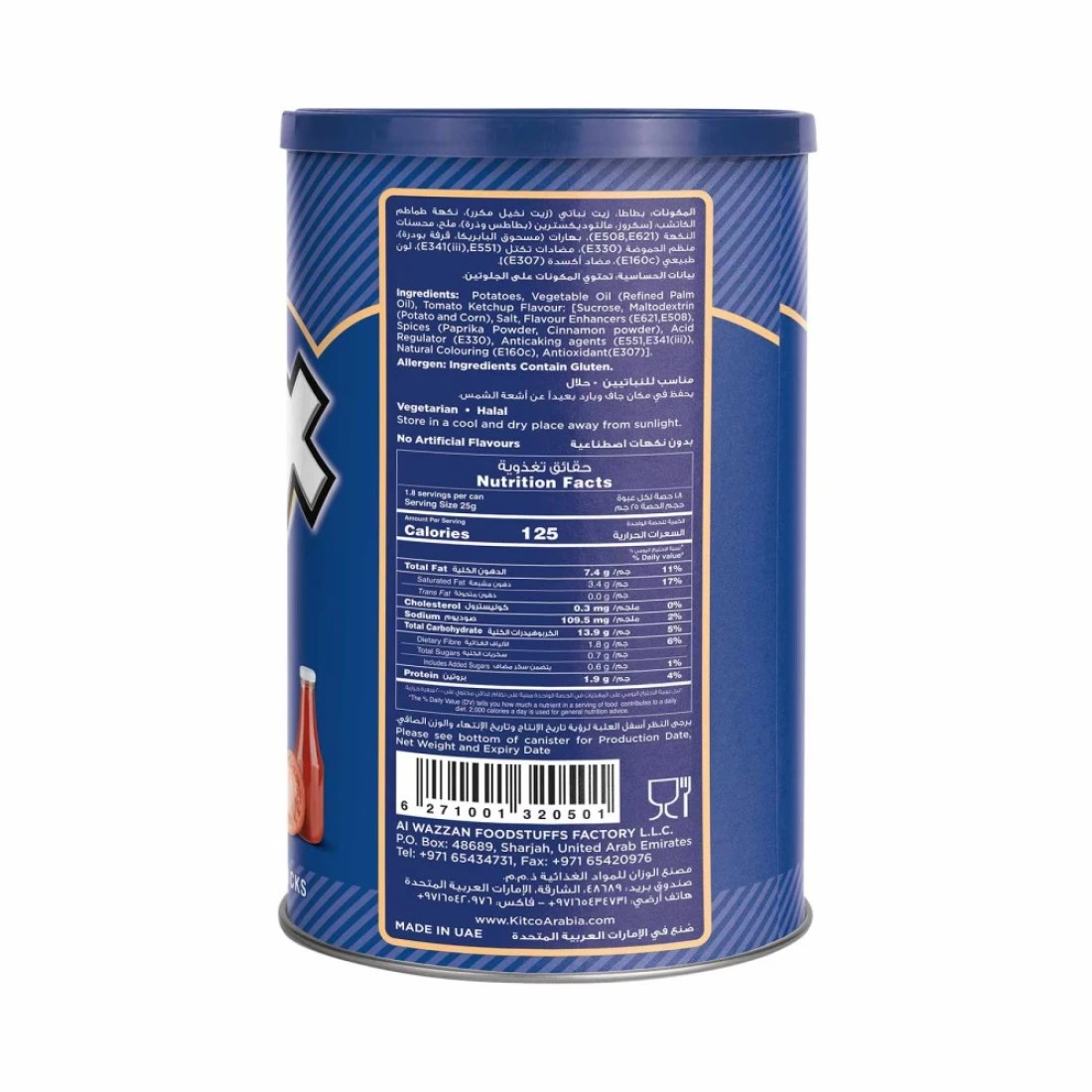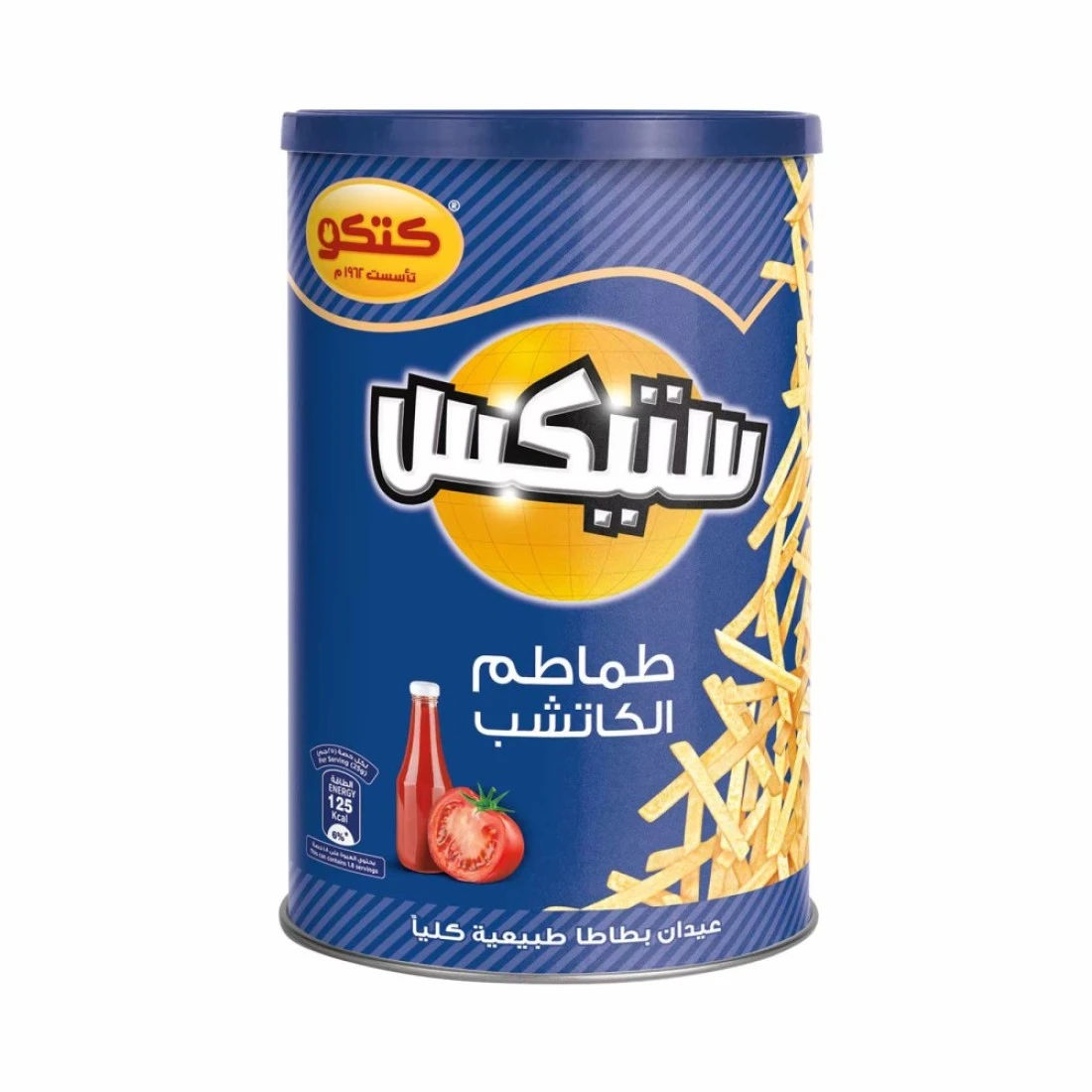 ingredients : المكونات: بطاطس، زيت نباتي (زيت النخيل المكرر)، نكهة كاتشب الطماطم: [السكروز، مالتوديكسترين (البطاطا والذرة)، ملح، معززات النكهة (E 621، E 508)، بهارات (مسحوق البابريكا، مسحوق القرفة)، منظم الحموضة (E 330). ، عوامل مقاومة للتكتل (E551،E341(iii))، ملونات طبيعية (E160c)، مضادات الأكسدة (E307)].